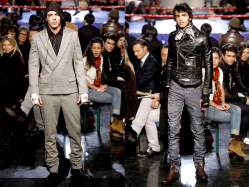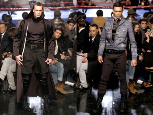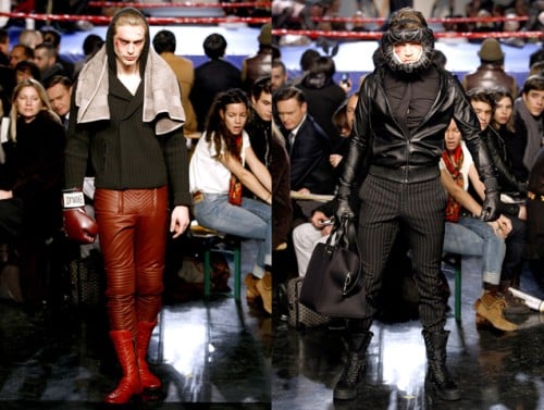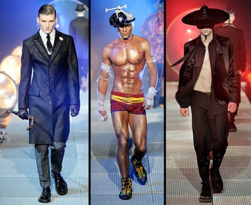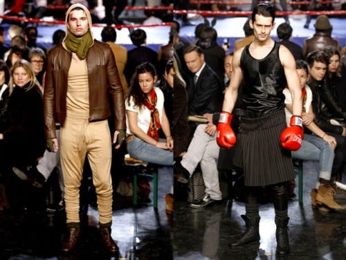 ‘While it was difficult to pin down the inspiration behind the new John Galliano collection, it is easy to do so for Jean Paul Gaultier: boxing and rough sports. The models came out with their boxing gloves and bruised faces to show the designer’s take on rough-chic. I thought the Dolce & Gabbana show was macho, but JPG has them beat.’ Homotography