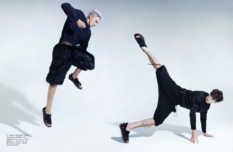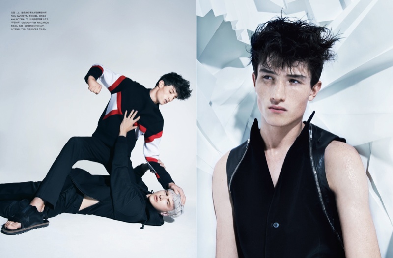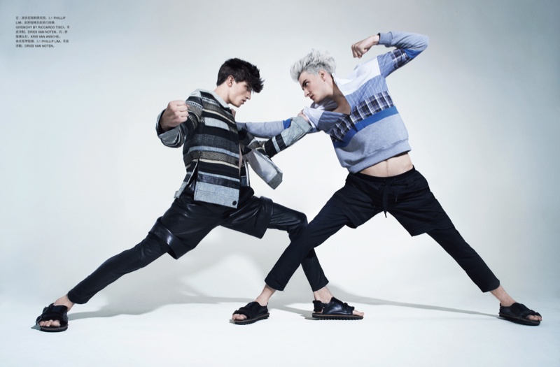 Face Off–Models Jester White and Benjamin Jarvis take to the September issue of Numero Homme China for a fun spread in which they duel. Photographed by Haruki Horikawa with styling by Jason Leung, dark sporty numbers from the likes of Givenchy and Dries Van Noten reign, lending the story a contemporary edge. / Hair by Cher D’Savery. Makeup by Emma Miles (Emma Davis). Courtesy of – thefashionisto.com