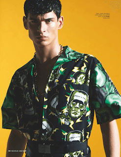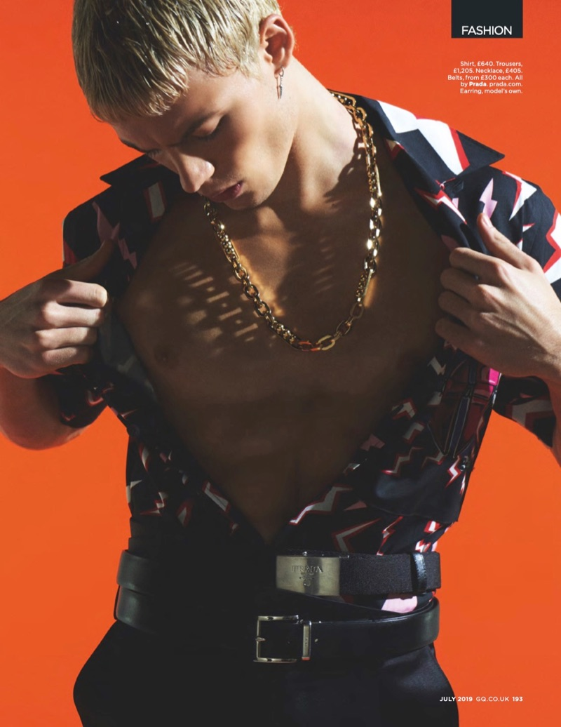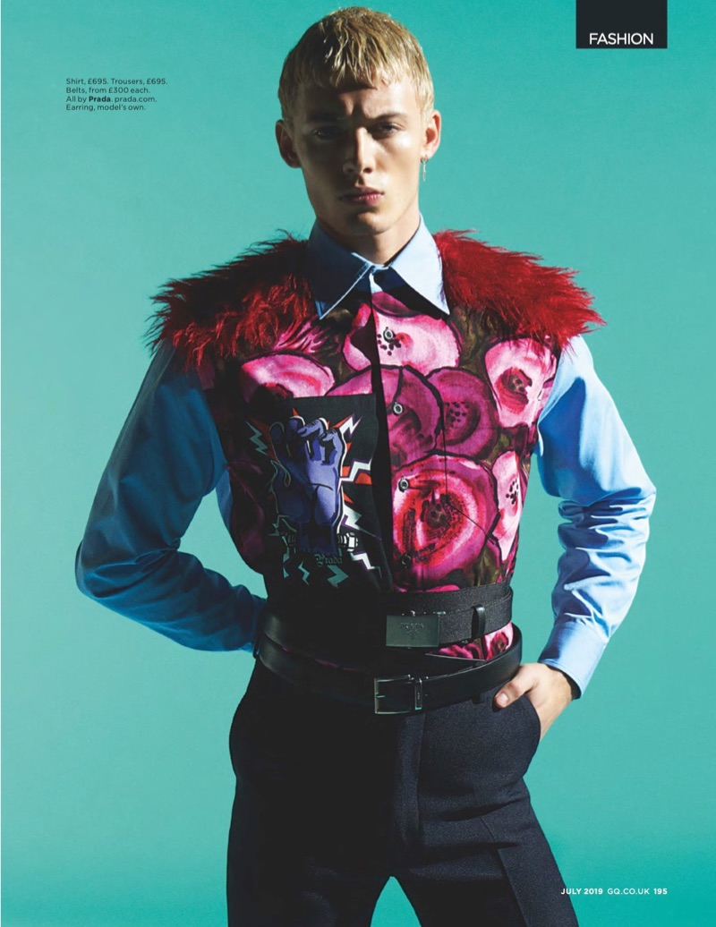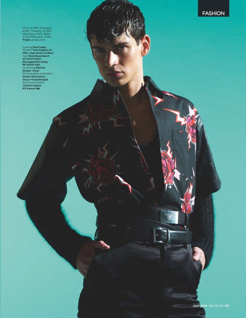 “It’s an homage to the Day of the Dead with Prada’s fall-winter 2019 men’s collection. Select pieces from the lineup are front and center for July’s issue of British GQ. Models João Knorr and Tom Hughes make a bold statement in Prada looks. Photographed by James Anastasi, the pair poses against neon backdrops. Sporting belted Prada ensembles styled by Luke Day, the models stand out in the label’s graphic shirts.” – TheFashionisto.com