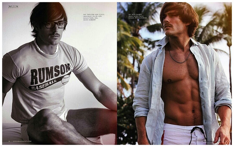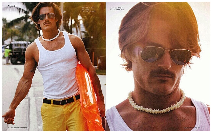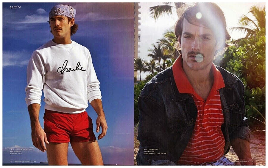 “Photographed for Men Moments, Wilhelmina New York model John Kenney links up with fashion photographers Michael Del Buono and Marco Marezza. Channeling 1970s style, John sports a mustache as he visits Fort Lauderdale for a relaxing getaway. Outfitted by stylist Taylor Bianco, John is captured in retro-inspired swimsuits and classic basics. / Grooming by Ido Raphael.” – TheFashionisto