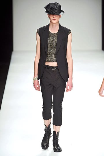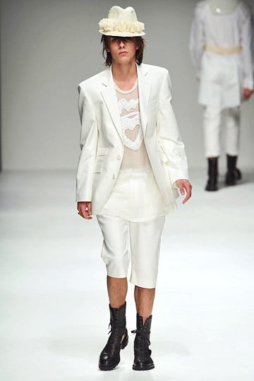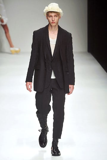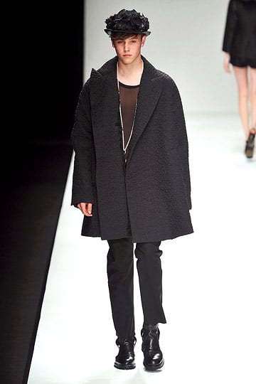 The flower-covered fedoras make me think that Rocha derived some inspiration from womens hats. The choice to mix flowers and fedoras is a curious one, but this inherent femininity is tamed somewhat by the oversized peacoats that many of the models wore.” Morphisis
