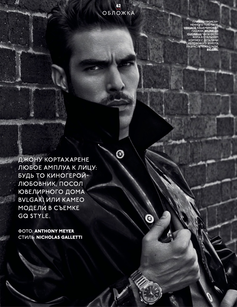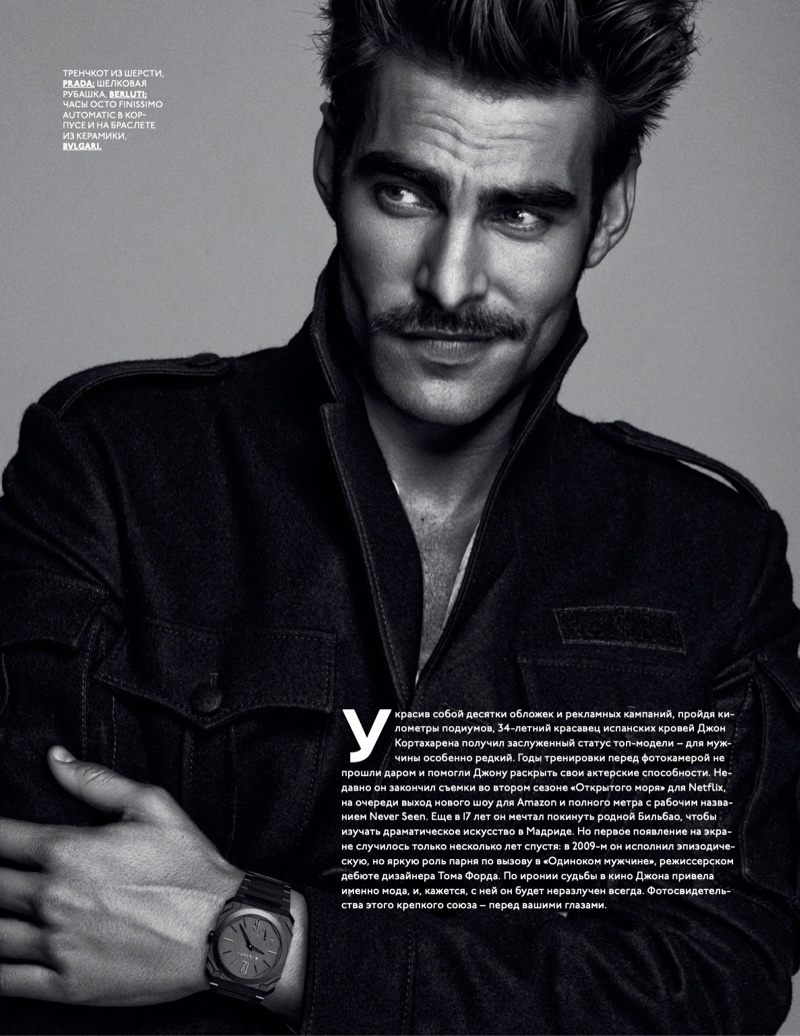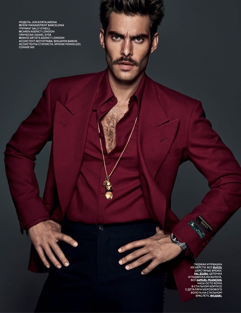 “Jon Kortajarena makes quite the fashion statement as he covers the fall-winter 2019 edition of GQ Style Russia. The Spanish model rocks a thick mustache as he hits the studio with photographer Anthony Meyer. A modern dandy, Jon sports a standout wardrobe. Nicholas Galletti outfits the top model in sharp tailoring and bold layering. Ready to turn heads, Jon dons brands like Dolce & Gabbana, Louis Vuitton, and Berluti.” – TheFashionisto.com