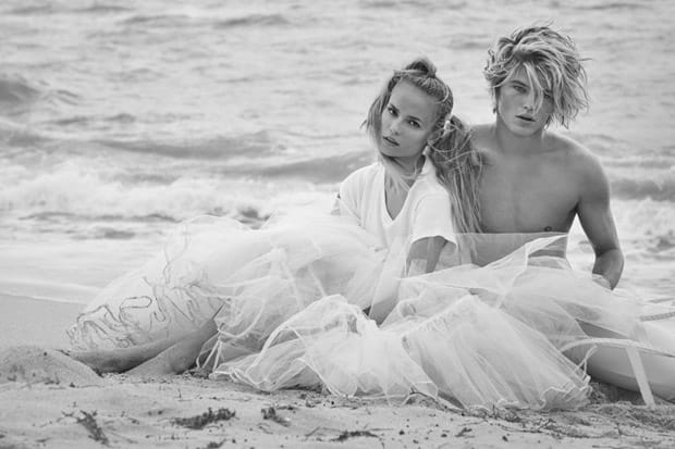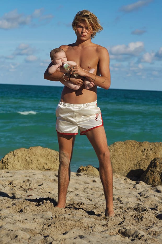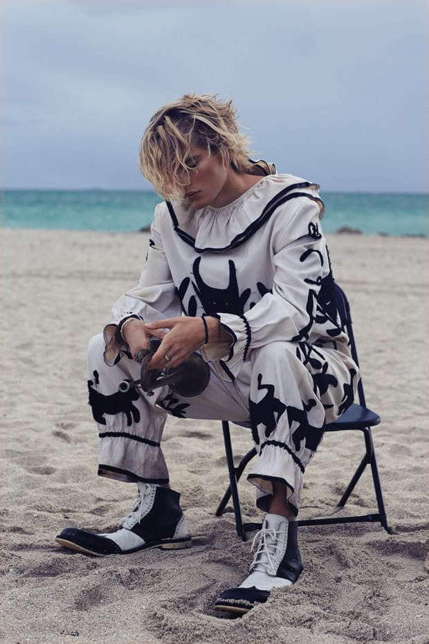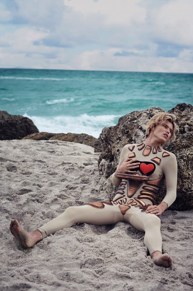 “Top model Jordan Barrett poses alongside Russian supermodel Natasha Poly for the cover story of Daily Front Row Miami‘s first edition captured by fashion photographer Sebastian Faena. Styling is work of Paige Reddinger, who for the session dressed models in Juan Gatti costumes. Makeup is courtesy of Paola Orlando, with hair styling from Steven Hoeppner.” – Malemodelscene.net
