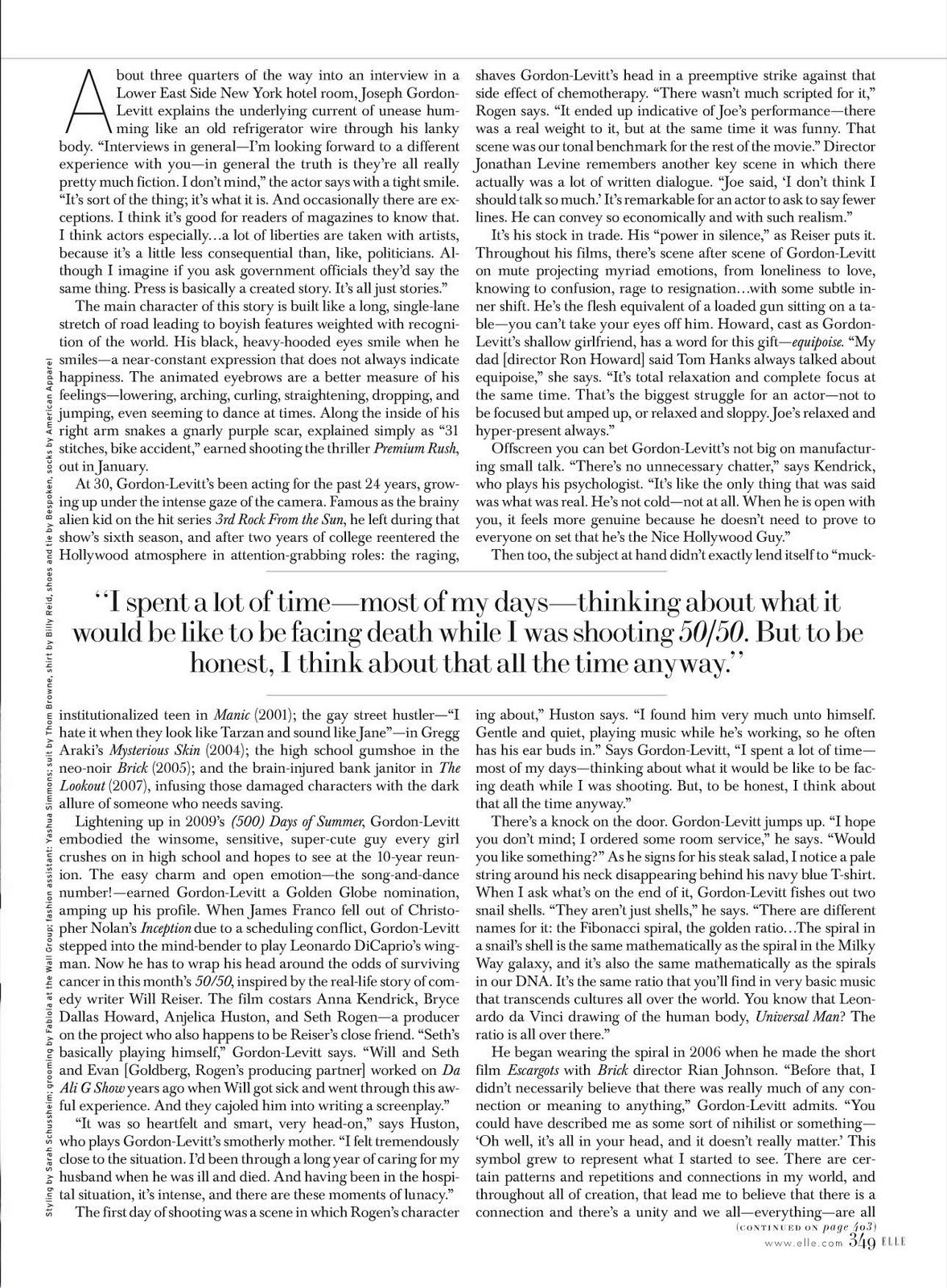50/50 co-star Bryce Dallas Howard, on Joseph…“My dad [director Ron Howard] said Tom Hanks always talked about equipoise. It’s total relaxation and complete focus at the same time. That’s the biggest struggle for an actor – not to be focused but amped up, or relaxed and sloppy. Joe’s relaxed and hyper-present always.”