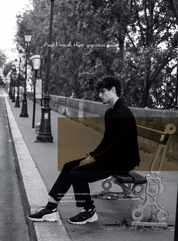 In charge of styling was Katarina Djoric who for the session selected looks from the likes of Kenzo, Icosae, Boris Bidjan Saberi, Drome, Editions M.R, Louis Gabriel Nouchi, Sadak, and more.” – Malemodelscene.net