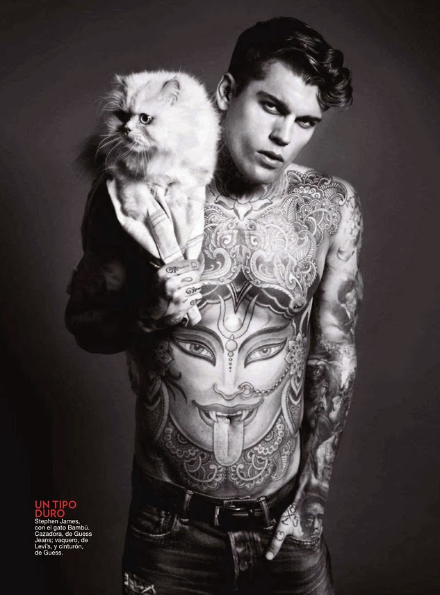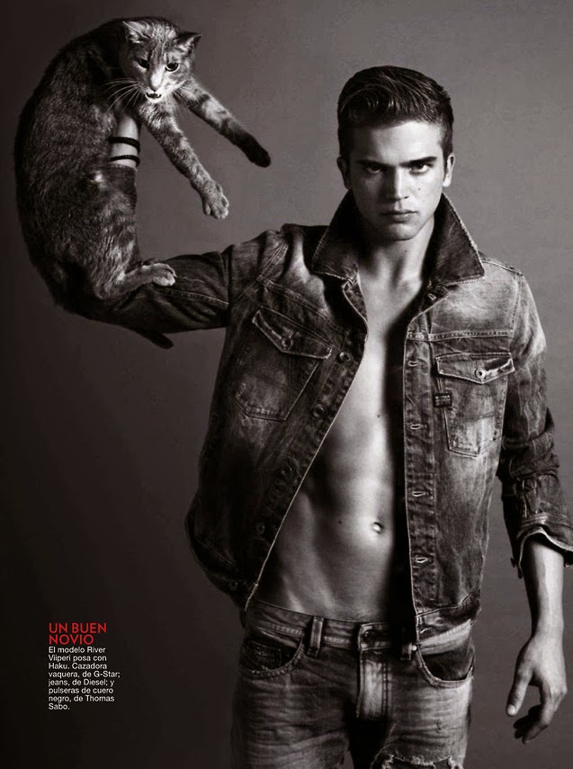 Models & Cats–Captured by photographer Sergi Pons for the July issue of Spanish Glamour, models Juan Betancourt, River Viiperi and Stephen James are in good company, sharing the spotlight with cats. With a story that explores the relationship between men and cats, the models pose for studio portraits, styled by Miriam Arruga in the timeless simplicity of denim. Delivering their favorite poses, Juan, River and Stephen also share their thoughts about cats and love, proving that masculine strength isn’t only about force. /Photo assistance by Anne Yarza. Hair & makeup by José Sequi. Courtesy of – thefashionisto.com