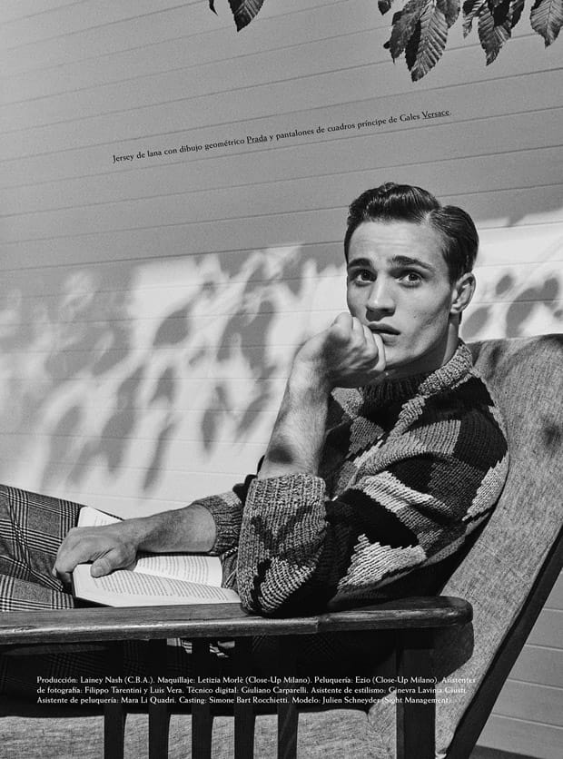 For the session Julian is wearing selected looks from top brands such as Versace, Louis Vuitton, Hermes, Gucci, Prada, Emporio Armani, Dior Homme, and Etro among other. ” – Malemodelscene.net