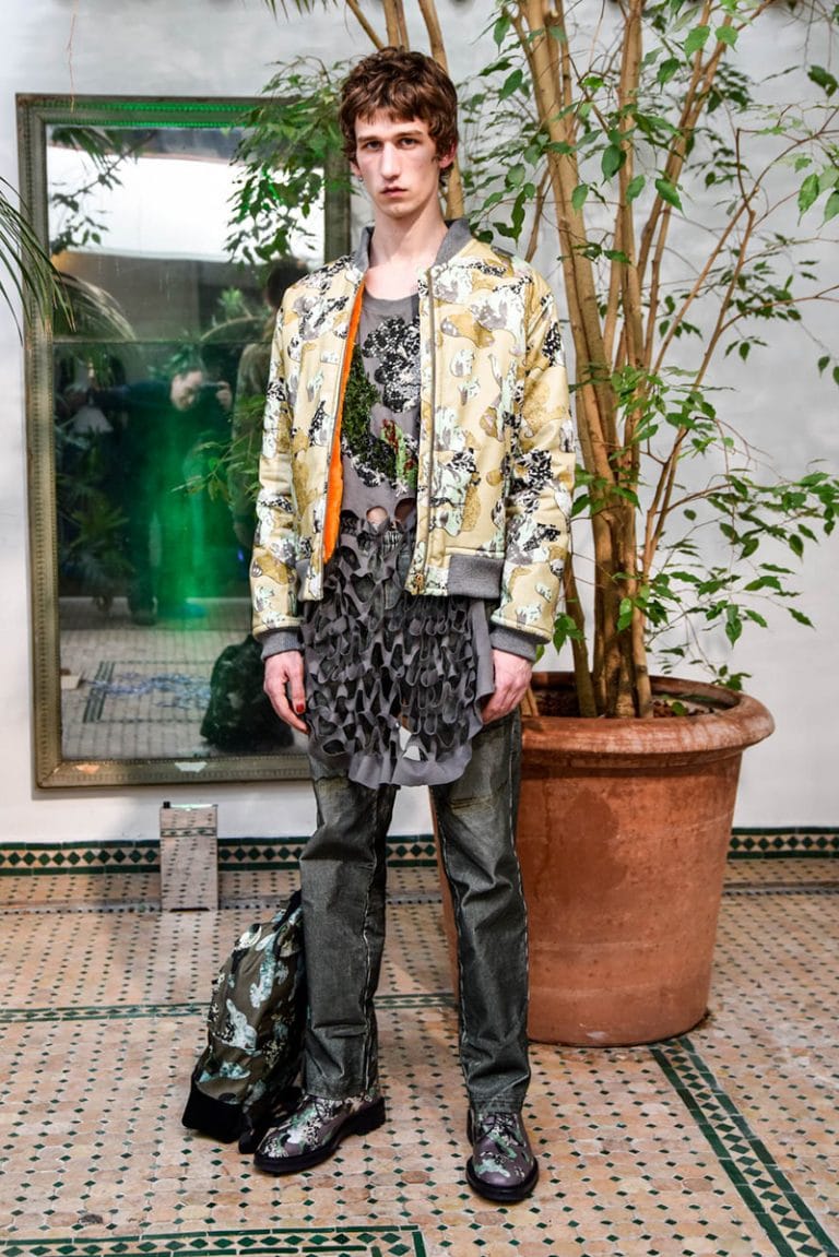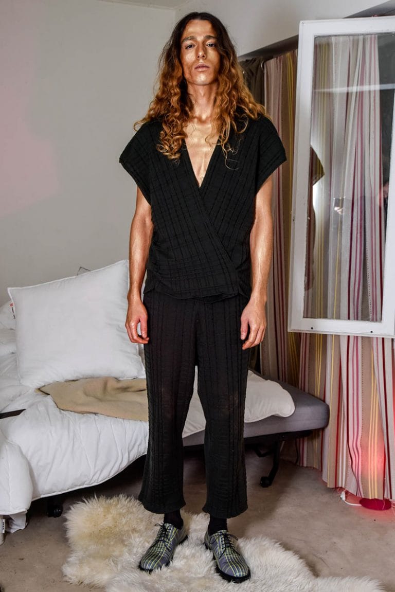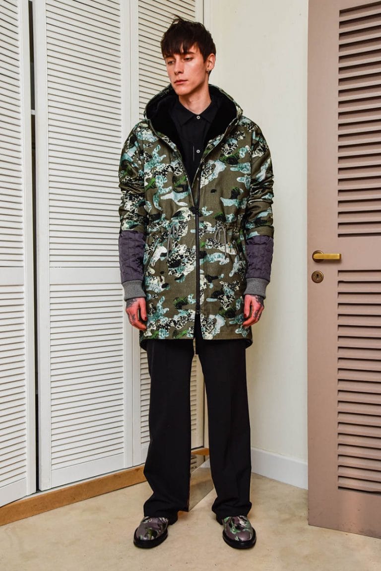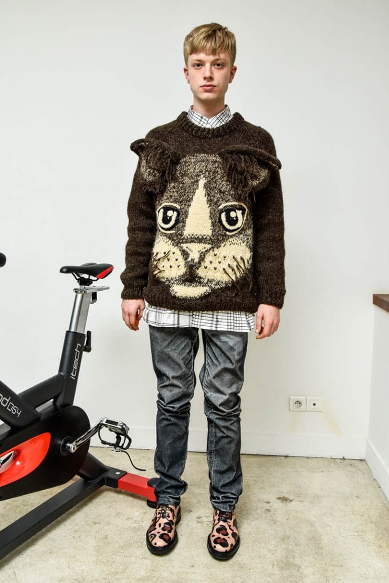 Julian Zigerli’s FW17 collection represents the guilty pleasures of the heart – what we all desire, but would never admit. Emphasising on everything in the familiar setting the humble house-cat calls home, the pieces showcase a warm, comforting core, teamed with an edge of narcissism and egoism for good measure. A key aspect of the collection is a series of prints created in collaboration with the Zürich based graphic trio, MOIRÉ. These include tartans made with domestic copy machines, graffitied brick walls reformed into an original camouflage and a graphically manipulated leopard print complete with a hidden face – another nod to the cat.” – FY Magazine.es