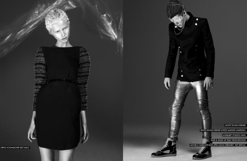 “Untrustus–Photographed by Ben Lamberty (Klaus Stiegemeyer), Julius Gerhardt of The Special and Spin model Charlotte Bos make for intriguing subjects in a story that tackles daring fashions. Born of another planet, the pair are clad in silver and black for a futuristic feat styled by Ariane Lindhorst (BiGoudi). / Grooming by Sina Velke (BiGoudi).” – thefashionisto.com