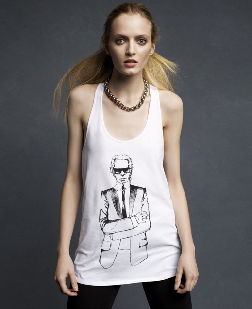 The 45 piece collection is comprised of flirty dresses–some feminine and floral, others crisper and more severe–thick tweedy separates (shorts and vests) and faux leather jackets. The simpler black and white dresses with sharp white collars stood out (they seemed the most Chanel-like) but my prediction is that the soft slouchy tees printed with Lagerfeld’s image, priced at $49, will fly off the racks.