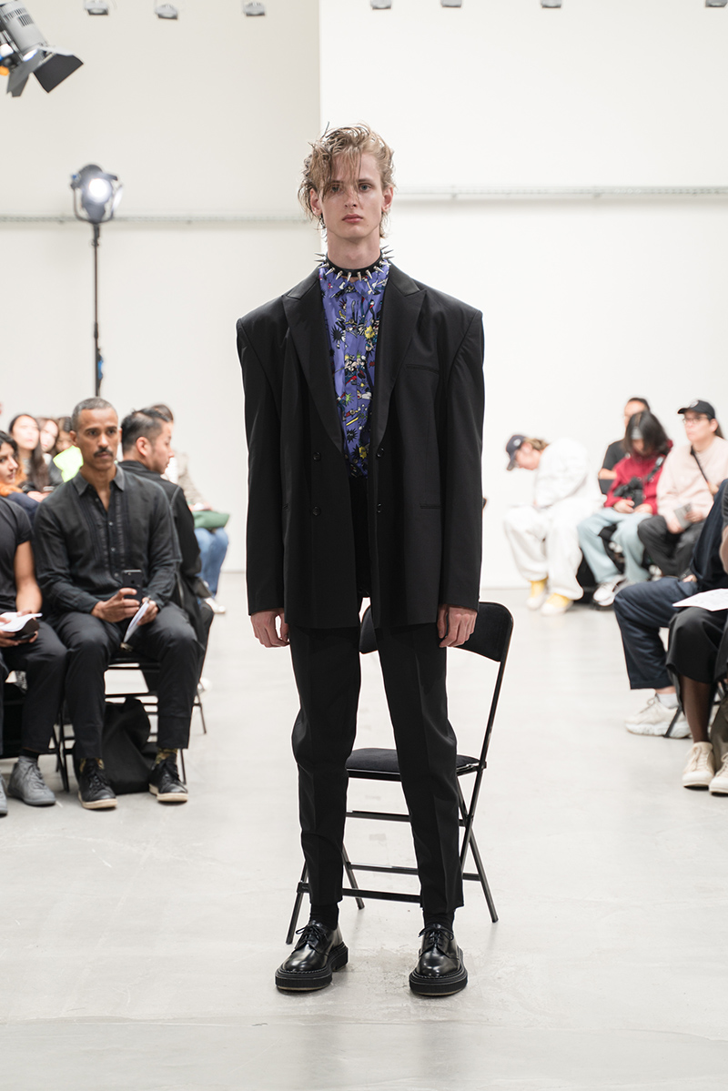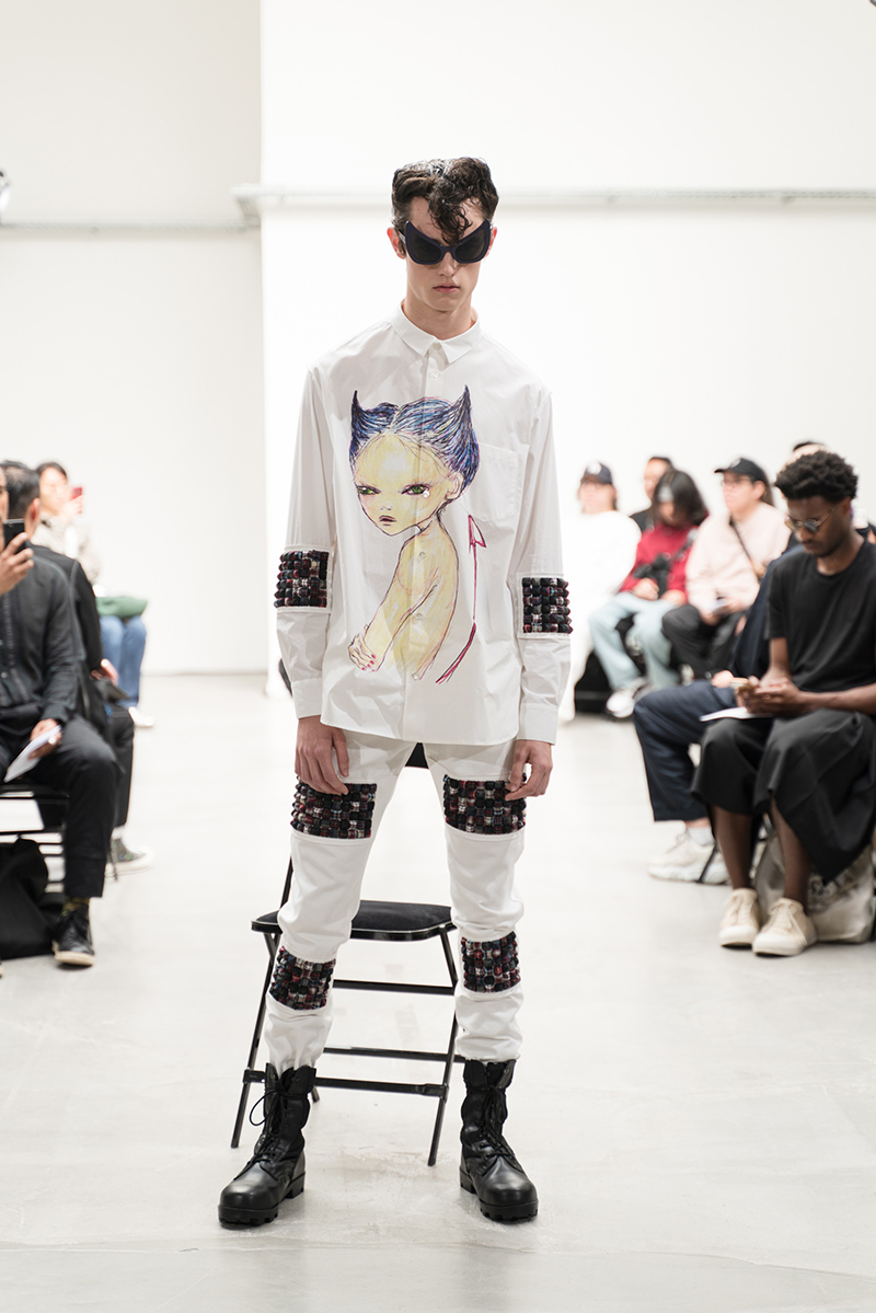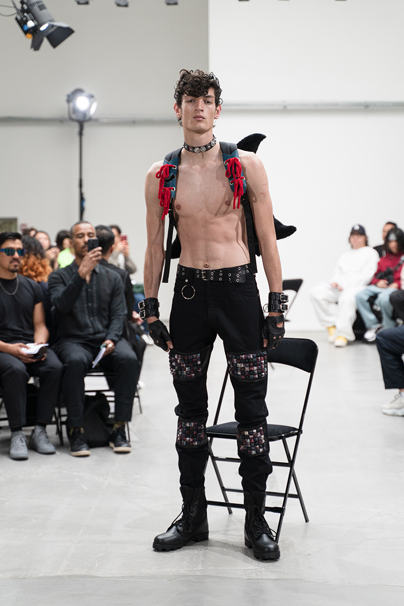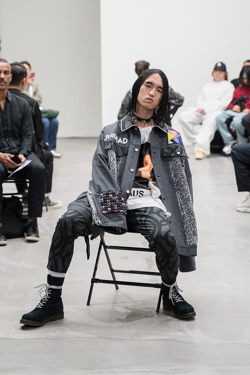 “The “DOUBLE DARE” collection of KIDILL is an homage to the vocalist Peter Murphy of legendary British gothic band BAUHAUS. Rare photos Peter Murphy, taken by iconic photographer Sheila Rock during 1978-83, are used throughout the collection. Rock is renowned for her photography documenting punk rock history shooting cult British bands like The Sex Pistols and The Clash. These iconic images are linked with the vivid memories of British youth culture, the Punk Rock movement. Punk Rock culture is the most important concept for the designer” – FY Magazine.es