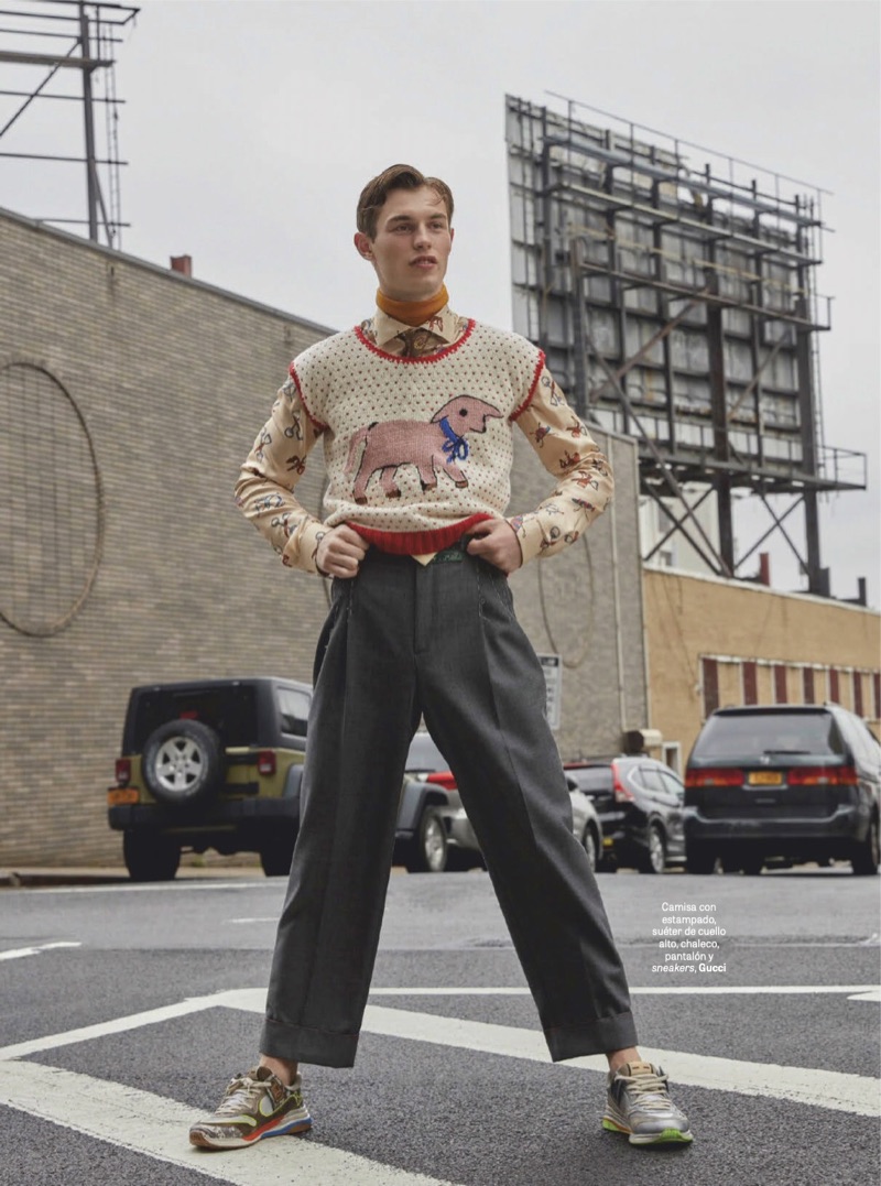 “Kit Butler embraces a quirky fall wardrobe for the September 2019 issue of GQ México. The leading British model stars in a Gucci-clad story lensed by photographer Ben Lamberty. Showcasing Alessandro Michele’s latest designs, Kit is styled by Mersi Kasemi. Front and center, Kit dons exaggerated proportions and bold prints. He sports a colorful lineup of jackets, knitwear, trousers, sneakers, and more.” – TheFashionisto.com