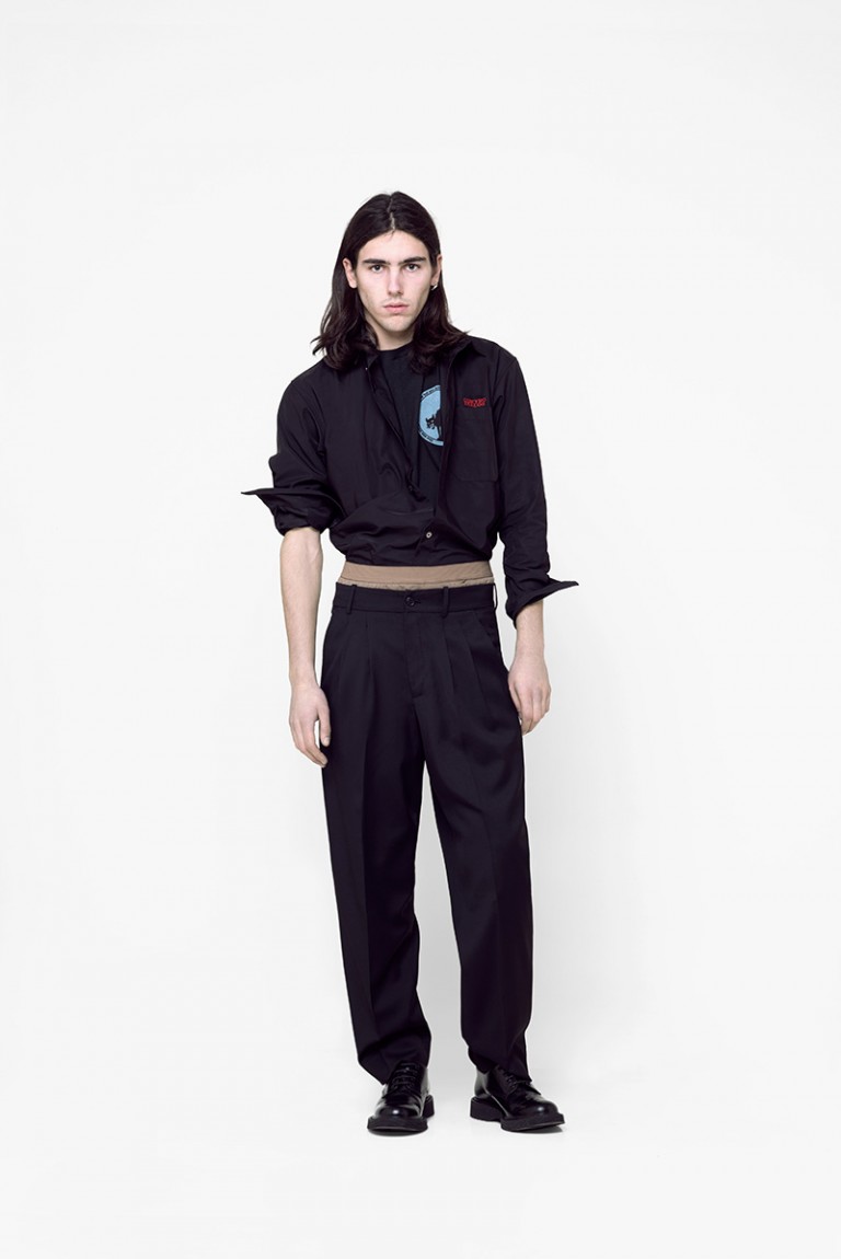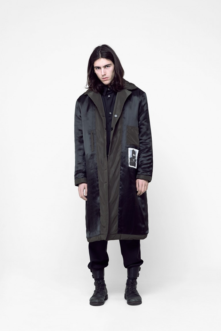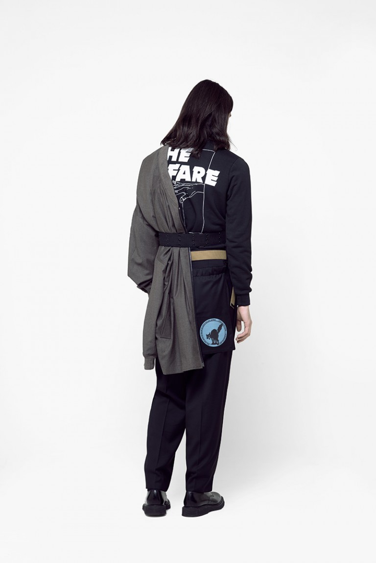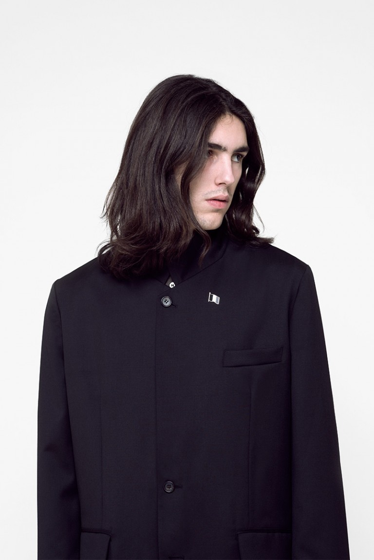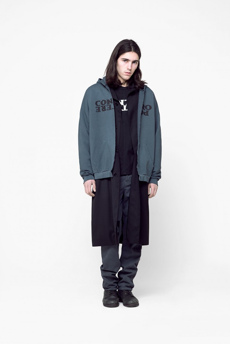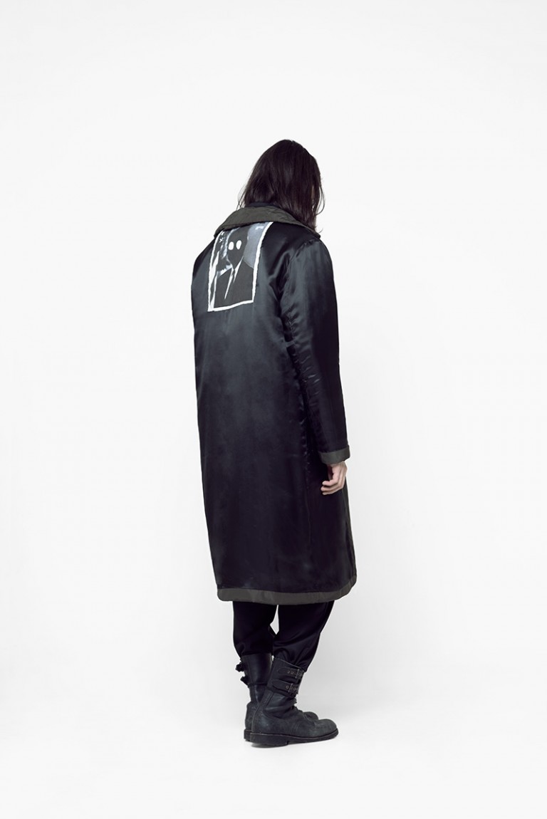 Words such as “contropotere“, the Italian word for counterpower, are embroidered into the garments. Standout pieces include images such as the black cat symbol are sown onto jersey hoodies and nylon capes like patches, overcoats, and pants. Everything is sourced and produced in Italy, from fabrics and prints to its impeccable tailoring.