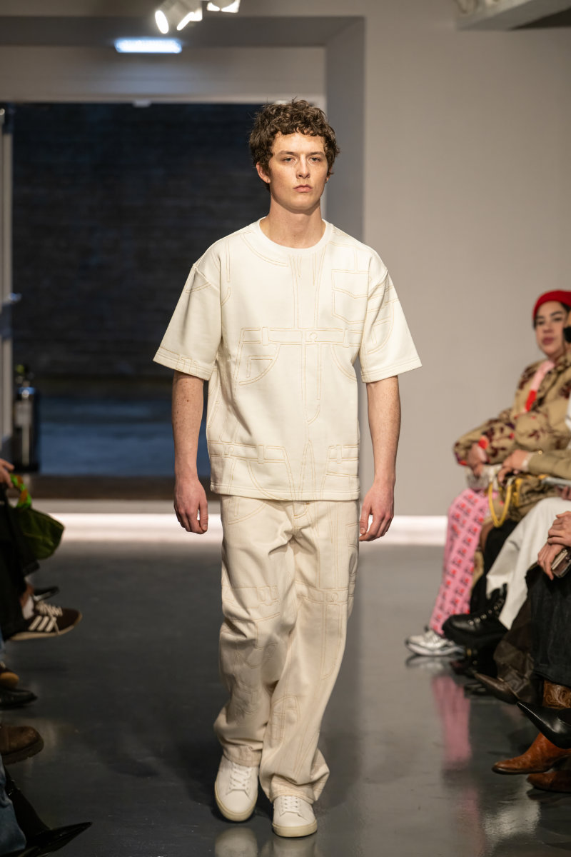 Look from Ksenia Schnaider’s Fall/Winter 2026 “Denim Workshop” runway collection featuring deconstructed and reconstructed denim elements Look from Ksenia Schnaider’s Fall/Winter 2026 “Denim Workshop” runway collection featuring deconstructed and reconstructed denim elements