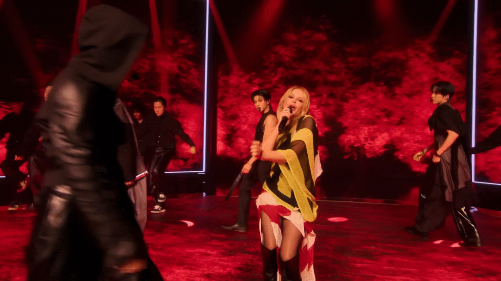 Kylie’s segment—styled in bold yellow and black with knee-high boots—features her trading verses with ATEEZ members Seonghwa, Yunho, Wooyoung, and Jongho, who deliver Korean lyrics that melt seamlessly into her iconic hook. It’s not just a duet—it’s a cultural exchange set to a hypnotic beat.