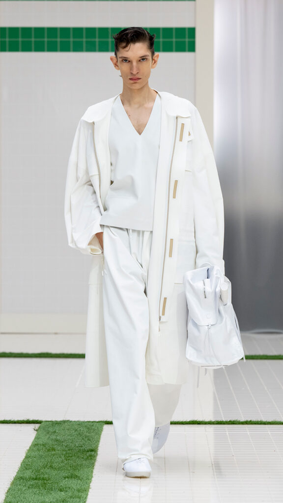 Expect sheer organza polos, mirror-leather trench coats, and tech-silk flyaway nylon pieces that evoke the voyeuristic intimacy of tiled locker rooms and fogged glass. The iconic Lacoste crocodile is reimagined through grass-court-inspired embroidery, while slogans like “Tennis for Everyone” and “Only for Tennis” add playful tension to the brand’s legacy.