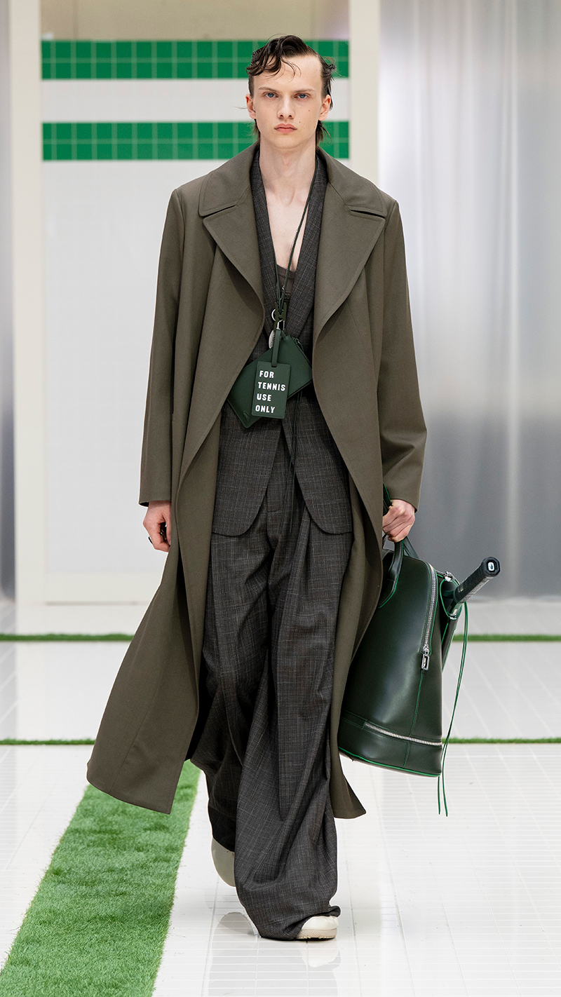 Expect sheer organza polos, mirror-leather trench coats, and tech-silk flyaway nylon pieces that evoke the voyeuristic intimacy of tiled locker rooms and fogged glass. The iconic Lacoste crocodile is reimagined through grass-court-inspired embroidery, while slogans like “Tennis for Everyone” and “Only for Tennis” add playful tension to the brand’s legacy.