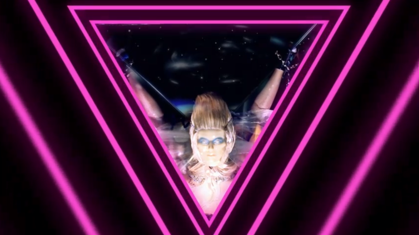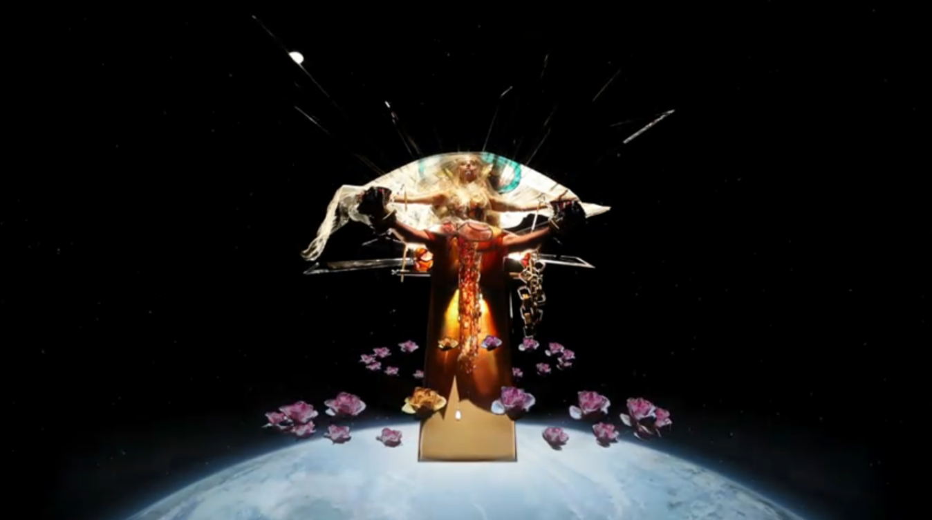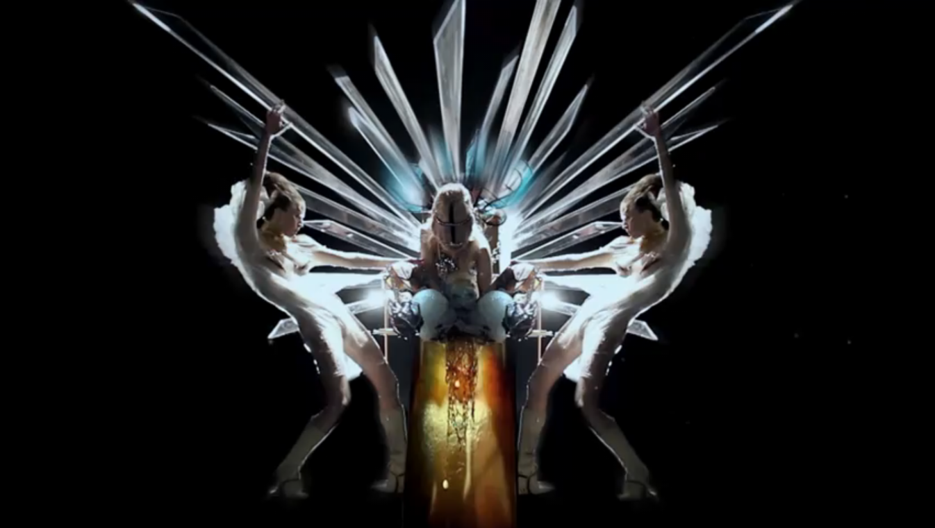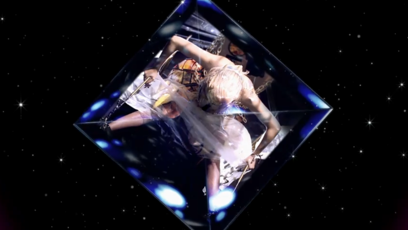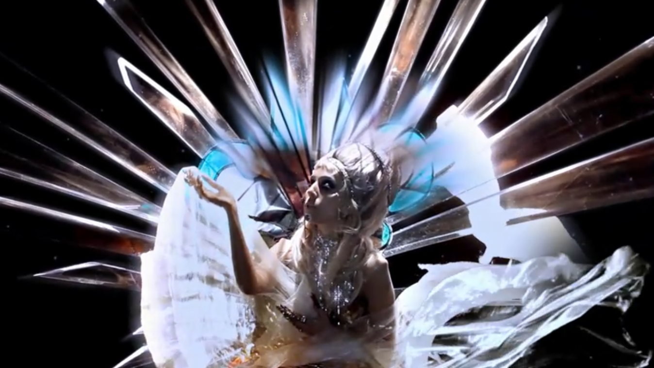 LADY GAGA wears stained glass dress by PETRA STORRS, technical chiffon by MUGLER