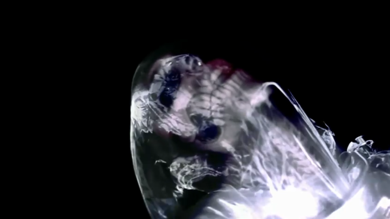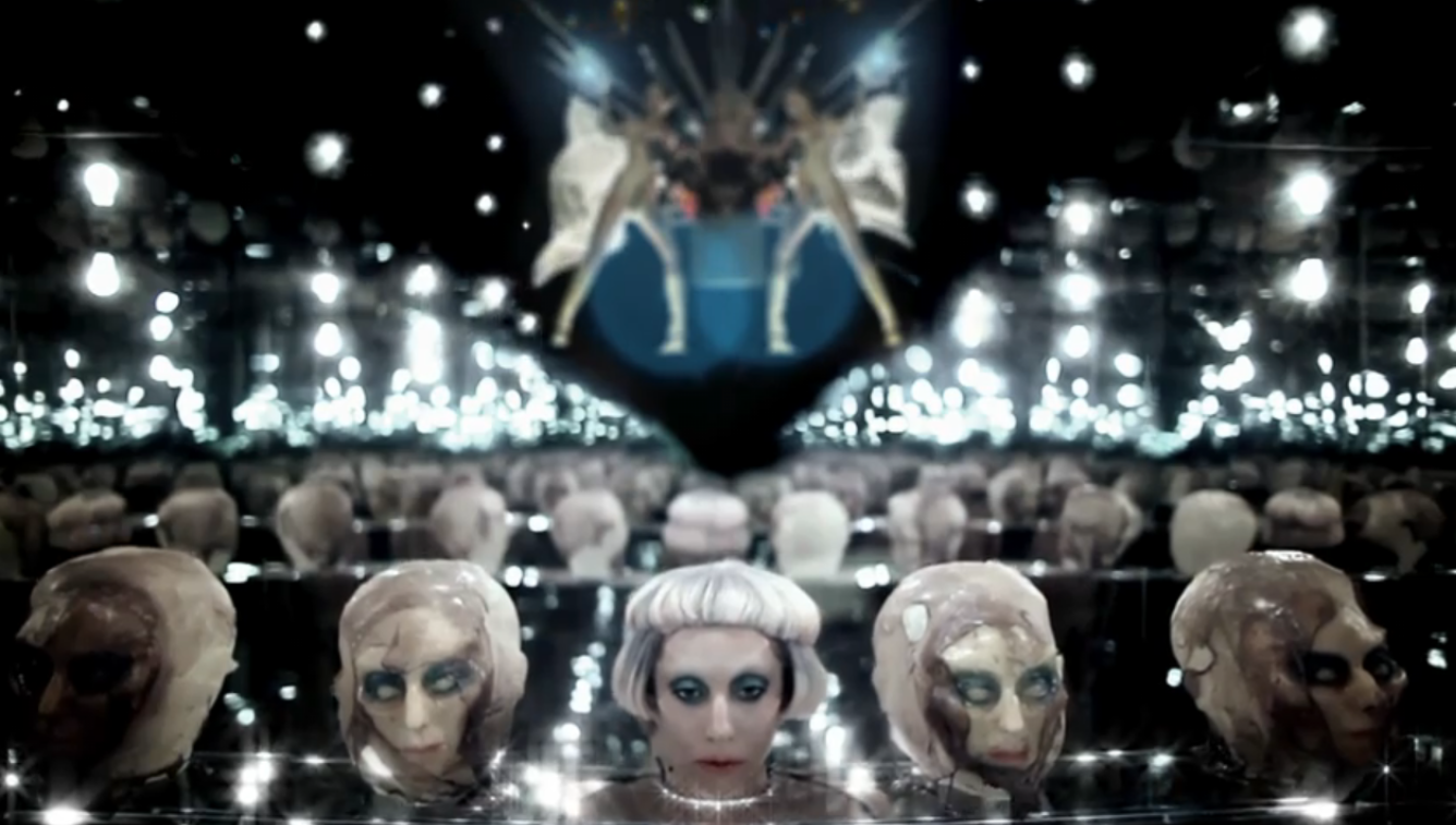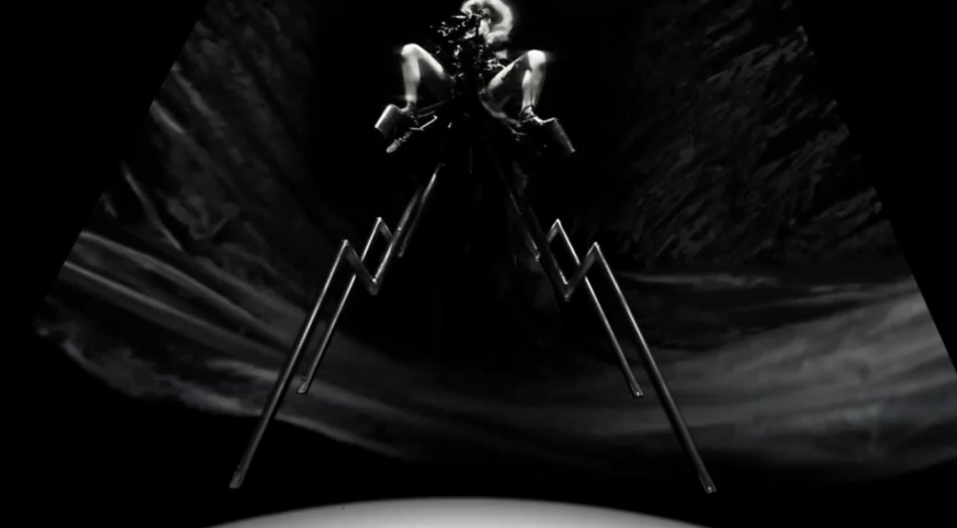 LADY GAGA wears finger rings by ERICKSON BEAMON, technical chiffon by MUGLER