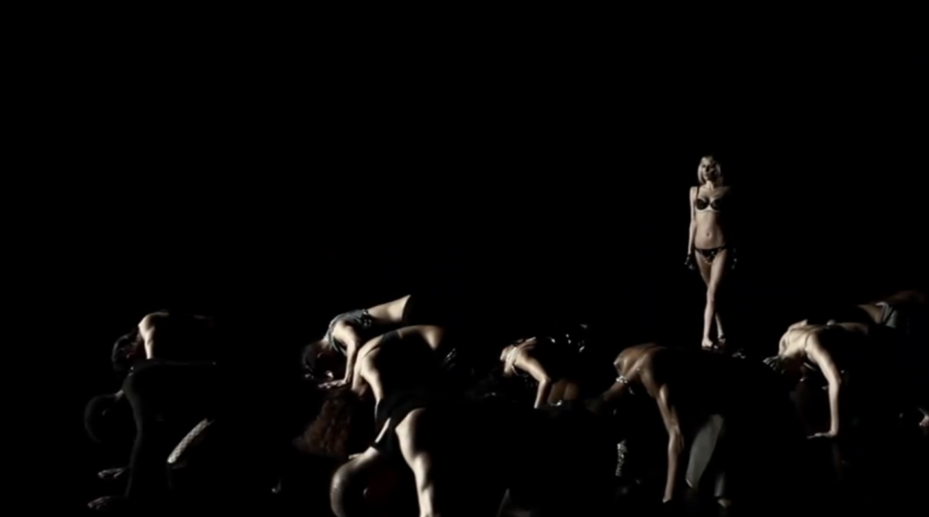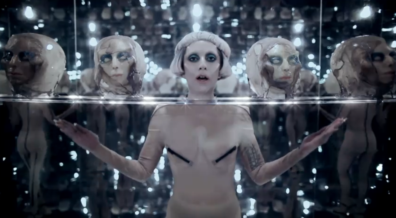 LADY GAGA wears bra by OMD, undewear by NYC SEX TRASH BY STEPHANIE PATEREK, gloves by LACRASIA, customized half sole shoes by CAPEZIO