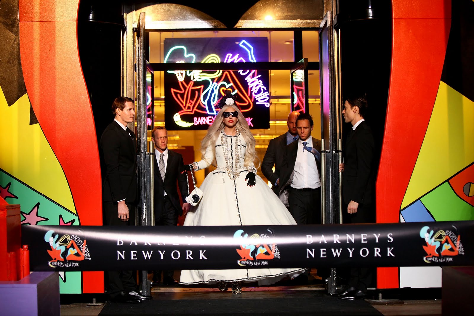 “To cut the ribbon of her highly anticipated Gaga’s Workshop at Barneys. Sadly, we missed Gaga’s giant-scissors-wielding entrance, but she clearly owned that custom-designed-by-Karl-Lagerfeld Chanel hoop-skirted ball gown.