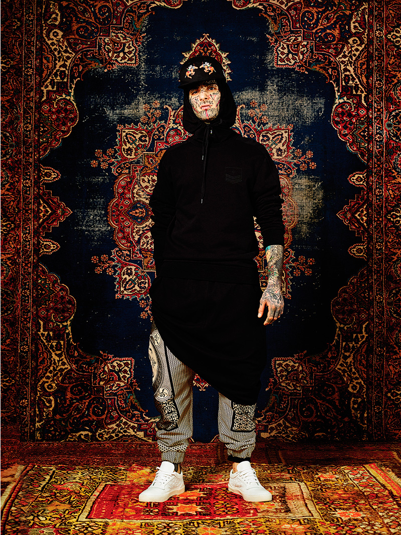 ‘Ottoman Punk’ becomes an abstract leitmotif, uniting the linear forms of architecture with an irreverent, contemporary attitude. A shadow play of ‘chiaroscuro’ colors lends neoclassical undertones to the season’s brooding digital prints, which juxtapose elements of Turkish costume with iconic faces from the realms of 20th century music, art, and pop culture.