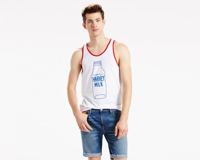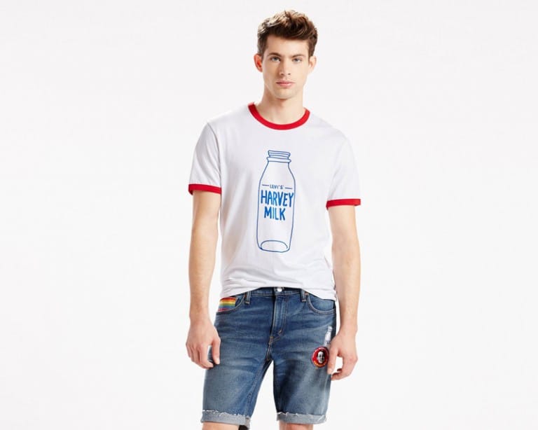 “Levi’s Pride 2016 collection continues with the brand’s tradition of supporting the LGBTQ community, with a portion of proceeds benefitting the Harvey Milk Foundation.” – FY Magazine.es