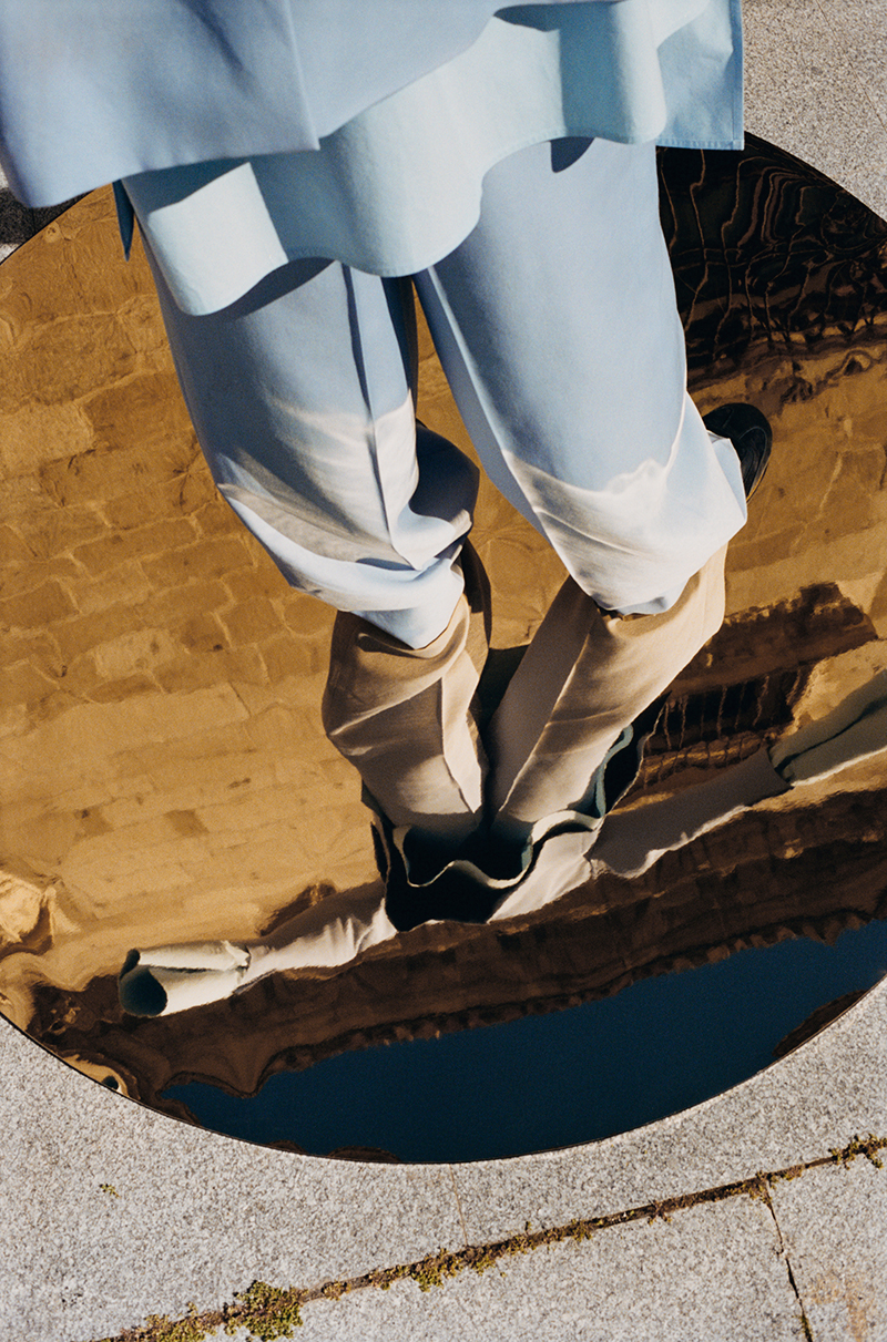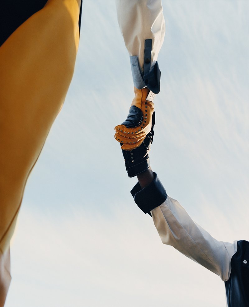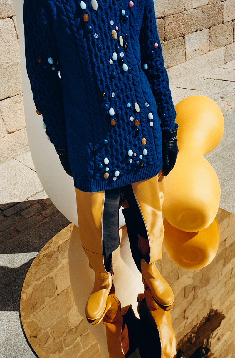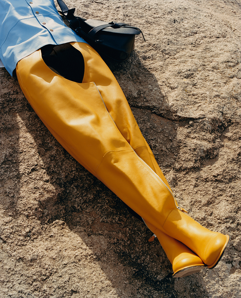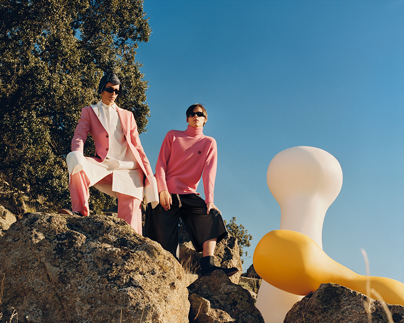 Some images include strange inflatable white and yellow objects. Their abstract volumes sharply offset the stone textures of the natural and man-made settings. These shapes reconfigure the landscape of walls and rocks with a sense of scale and depth, all while creating a loose visual link to the silhouettes and colors featured in the collection.” – FY Magazine.es