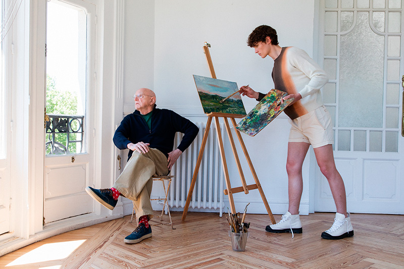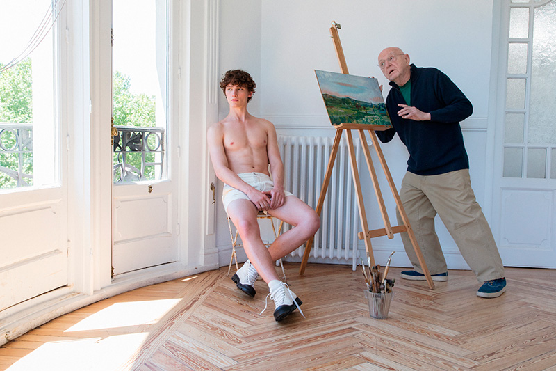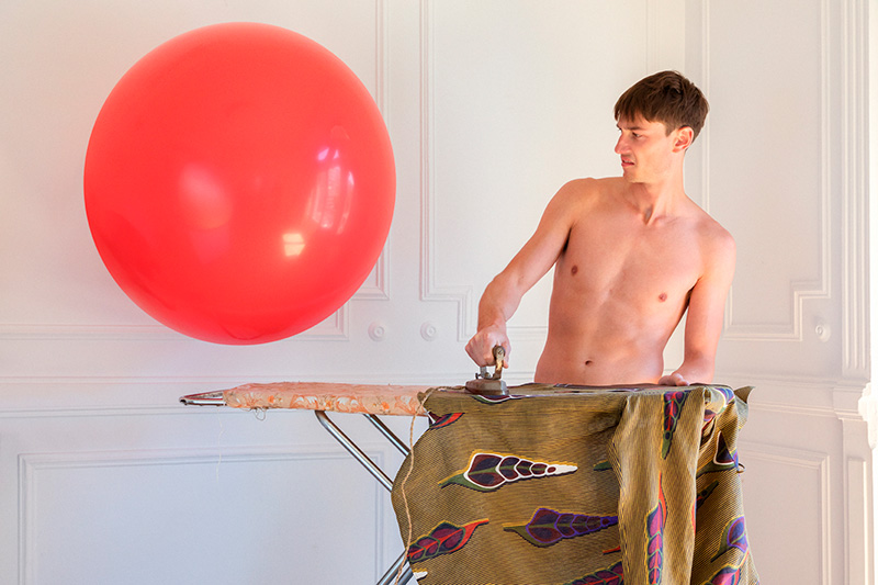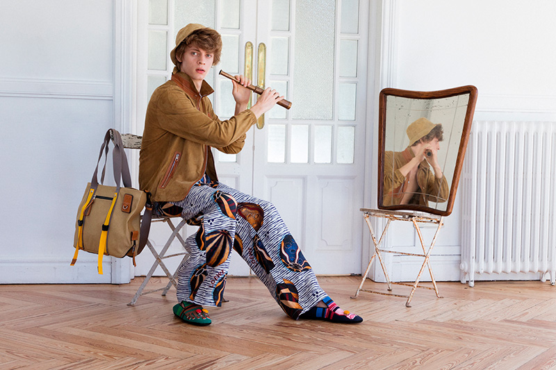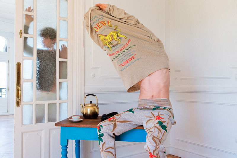 In a second collaboration with American art photographer Duane Michals, the collection takes centre stage at Casa Gallardo, a private home in Madrid, as eleven male protagonists perform in various states of dress (and undress). Michals tells an absurd narrative through handwritten titles – his spontaneous imagery conjuring up a variety show of timeless domestic heroes.” – FY Magazine.es