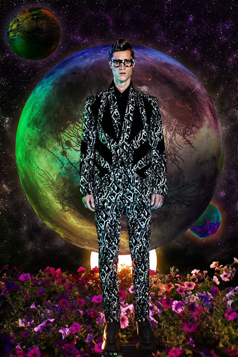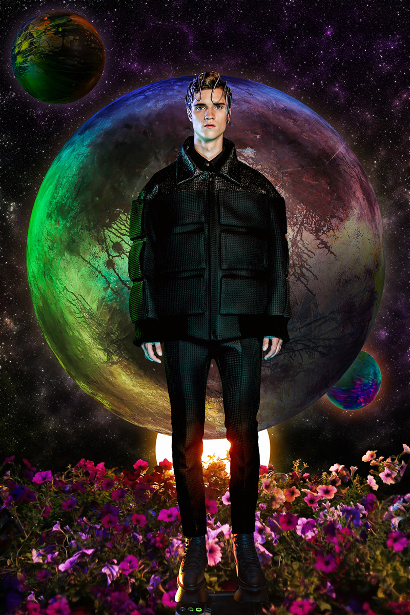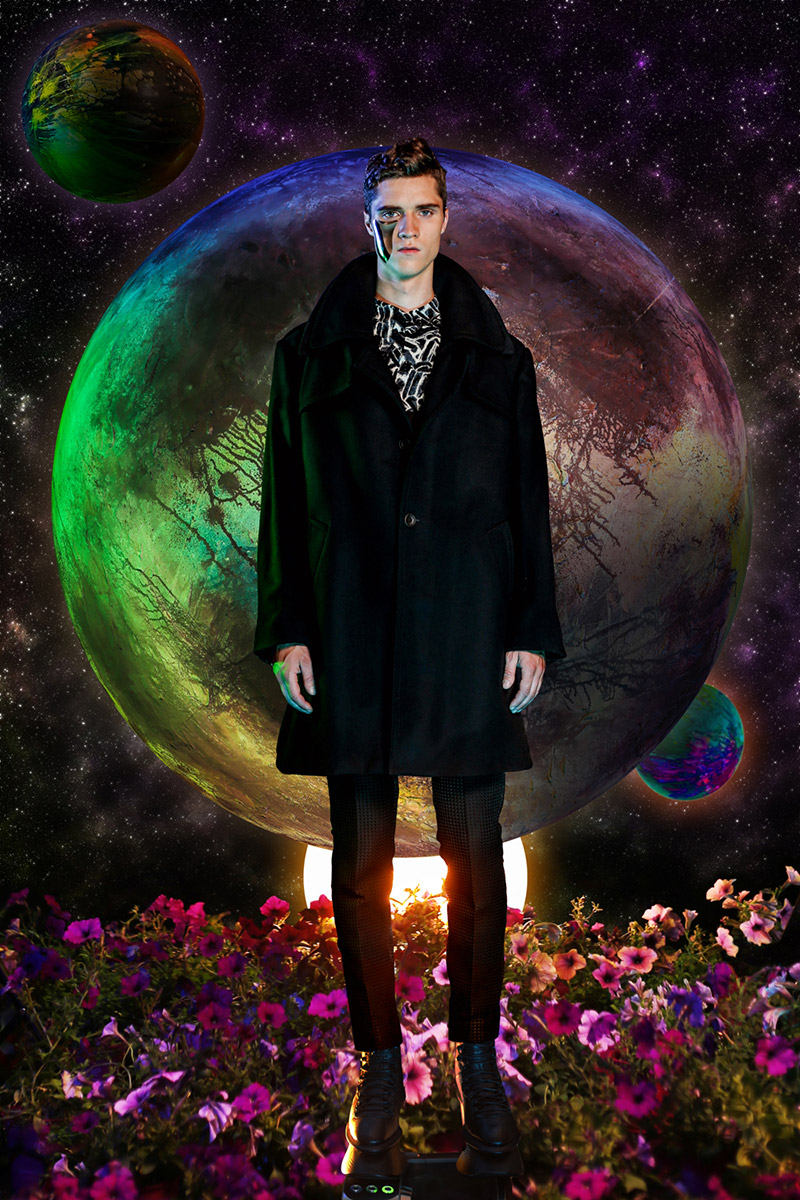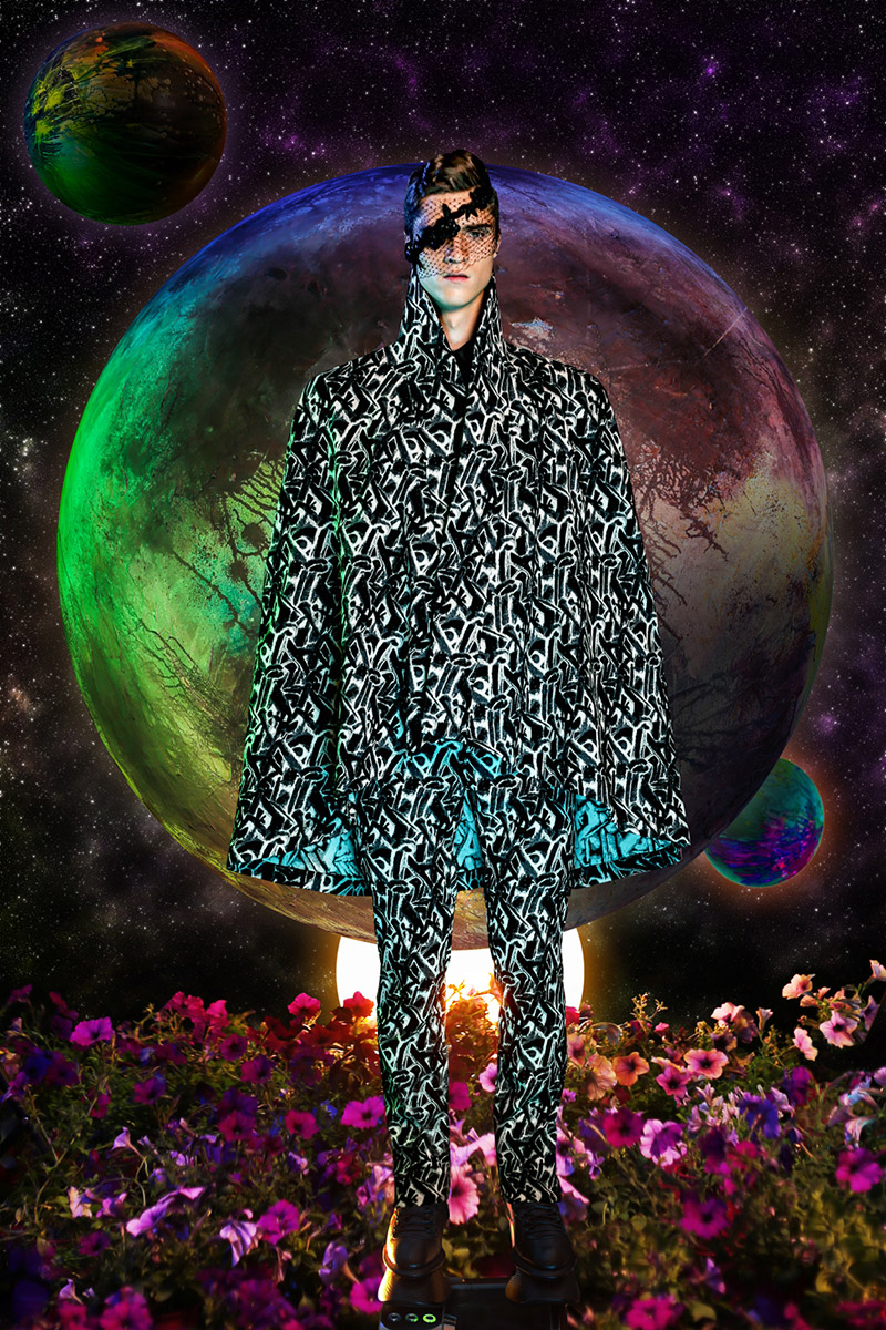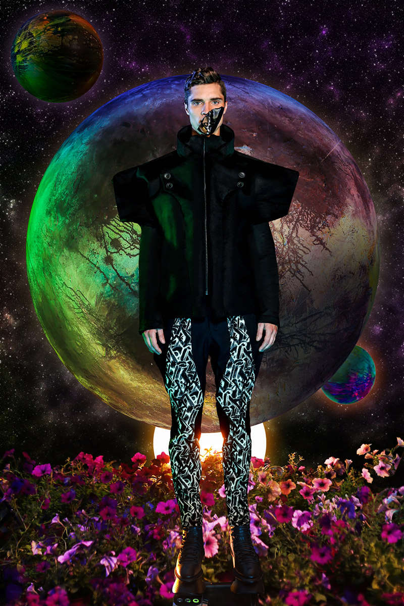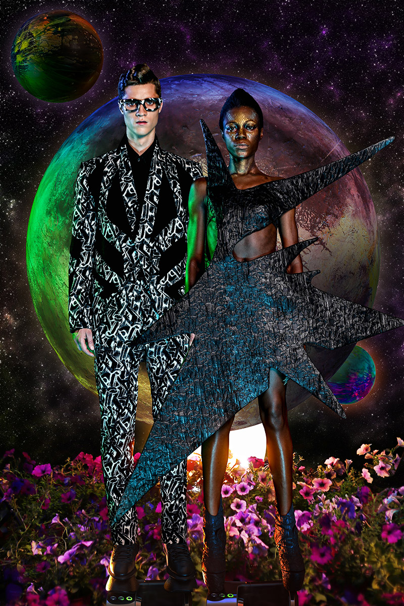 “Another galaxy from Earth. As the name implies, this collection was inspired by the unknown world of the black hole and and explores the concept of interacting with Dark Matter using men’s and women’s garments as the medium. Graphic prints reminiscent of supernova highlight the men’s collection. Long Tran uses architectural silhouettes and extended collars to explore the relationship of the physical body to the space it inhabits.