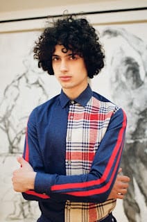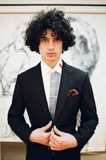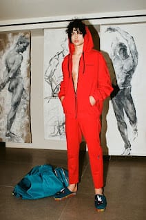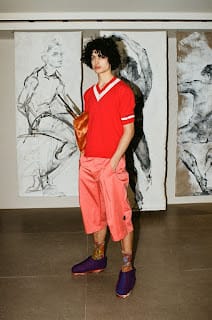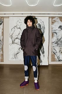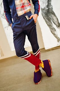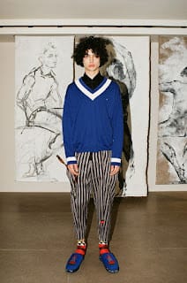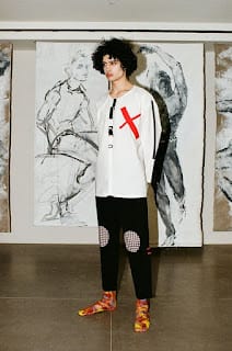 Created around classical men’s silhouette, the collection features suites and coats, combined with youthful details such as pants with knee patches and white shirts with hand-colored collars.
