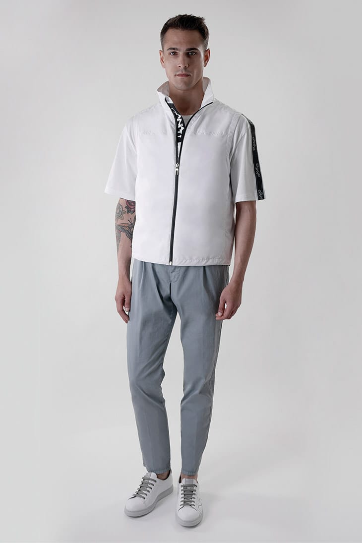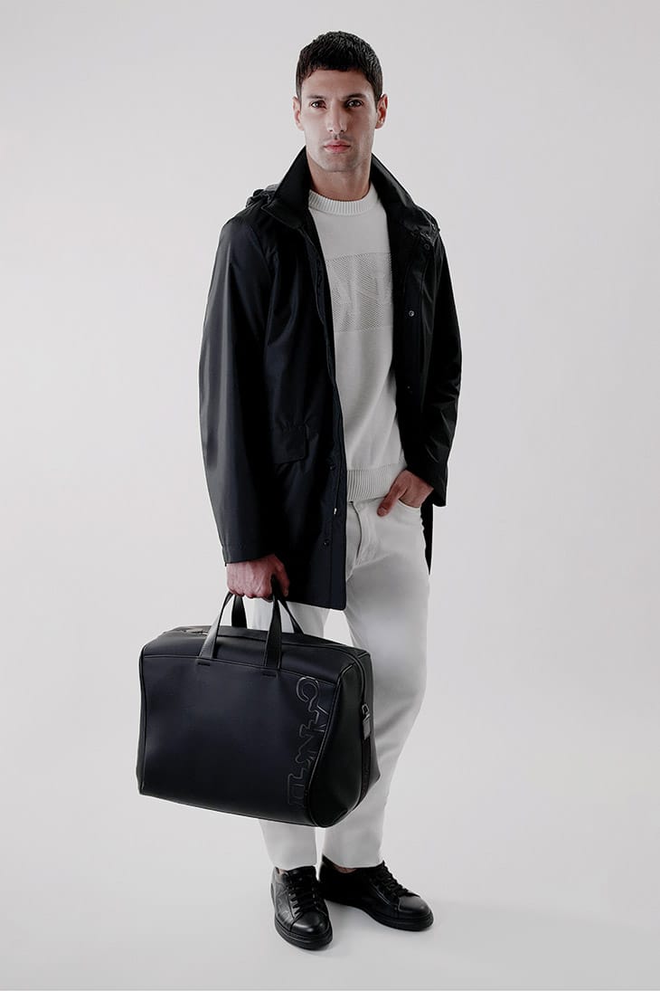 “T-shirts, sweaters, tracksuits, sweatshirts, and suits in soft jersey materials, along with waterproof jackets rendered in technical materials, are united by a common material: Leaftec. Exclusive to Canali, the special fabric is lightweight and breathable while simultaneously resistant to wind, rain, and abrasion. Furthermore, ultralight runners, bags, and backpacks in a rubber material transcend mere stylistic codes, favoring an all-encompassing lifestyle.” – Malemodelscene.net