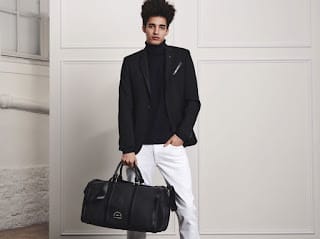 Styles are inspired by the masculine influences of military tailoring and historic armor. Next to the signature black and white palette there are saturated jewel tones like rich emerald green and intense burgundy; the look is further elevated with perforated leather and textured boucle fabrics. – from Karl Lagerfeld” – Malemodelscene.net