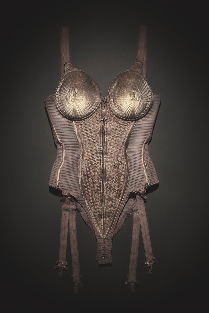 Phillips dubbed Madonna’s partnerships with Gaultier “collaborations that would become legendary.” While the singer has worked with a host of designers over the years, including Dolce & Gabbana, DSquared2 and Riccardo Tisci, her work with Gaultier has been particularly impactful. Two corset looks from 1990’s “Blonde Ambition” tour make the exhibit: a pink silk satin bodysuit with conical bust cups, paired with black pinstripe dress pants, which was worn for the opening “Express Yourself” number, and a gold lamé version, also with conical bust cups, worn for “Like a Virgin.”