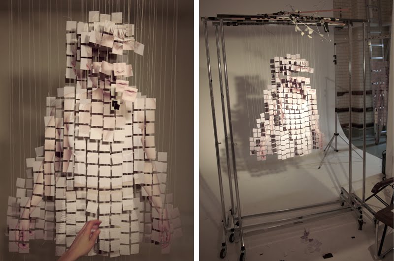 Suspended from a delicately constructed coat hanger construction floats a seven layered paper pixel textile of electro-pop icon Robyn, with the real Robyn knitted amongst her seven other selfs. Constructed over two days by Lucy and the Dream Team Robyn’s third epic album is borne!