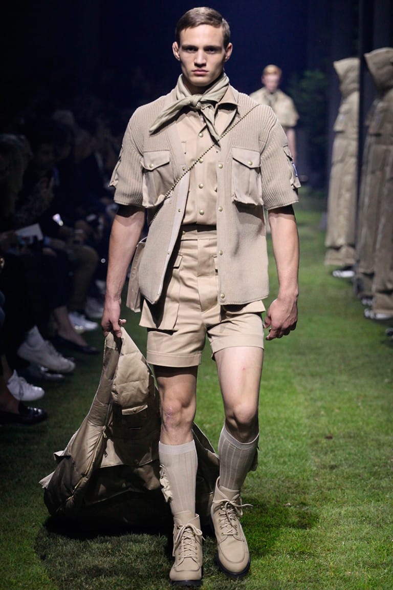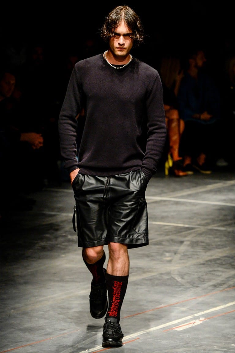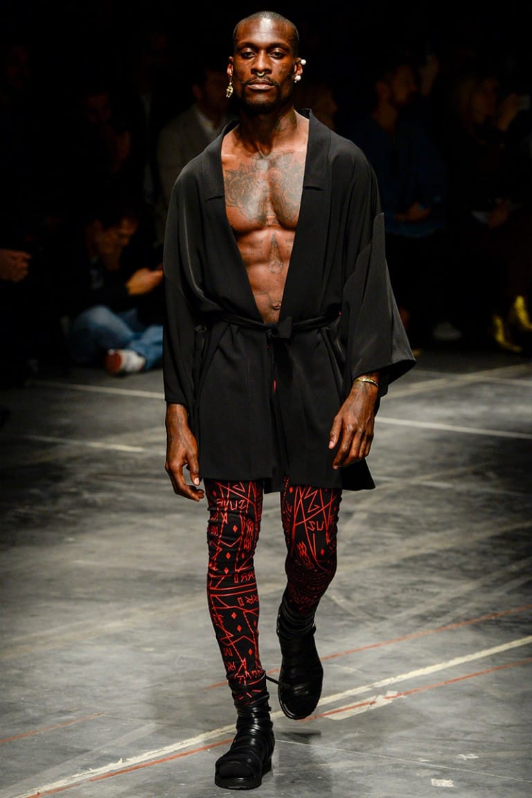 The collection is an ode to noise that ignites unstoppable waves of change. Under the slogan SONIDO, spelt out loud in gothic fonts, a new cultural clash happens within the County of Milan premises. Numbers and graphic weaves mix with Ninja stars and County’s very own Patagonian symbols, swarming on bomber jackets, hoodies, tops and shorts. Kimonos both long and short and sliced samurai skirts point towards the East, chain-mail and PVC nod at the future, lace-up trousers provide a slight tingle of fetish. Shapes have both an utilitarian and adventurous feel, while a profusion of embroideries adds texture and visual stimulation. Clear PVC parkas and elongated sheer vests amplify the layering of the looks. Robotic trousers, jumpsuits and multi-pocket field jackets put a combat mode into play.