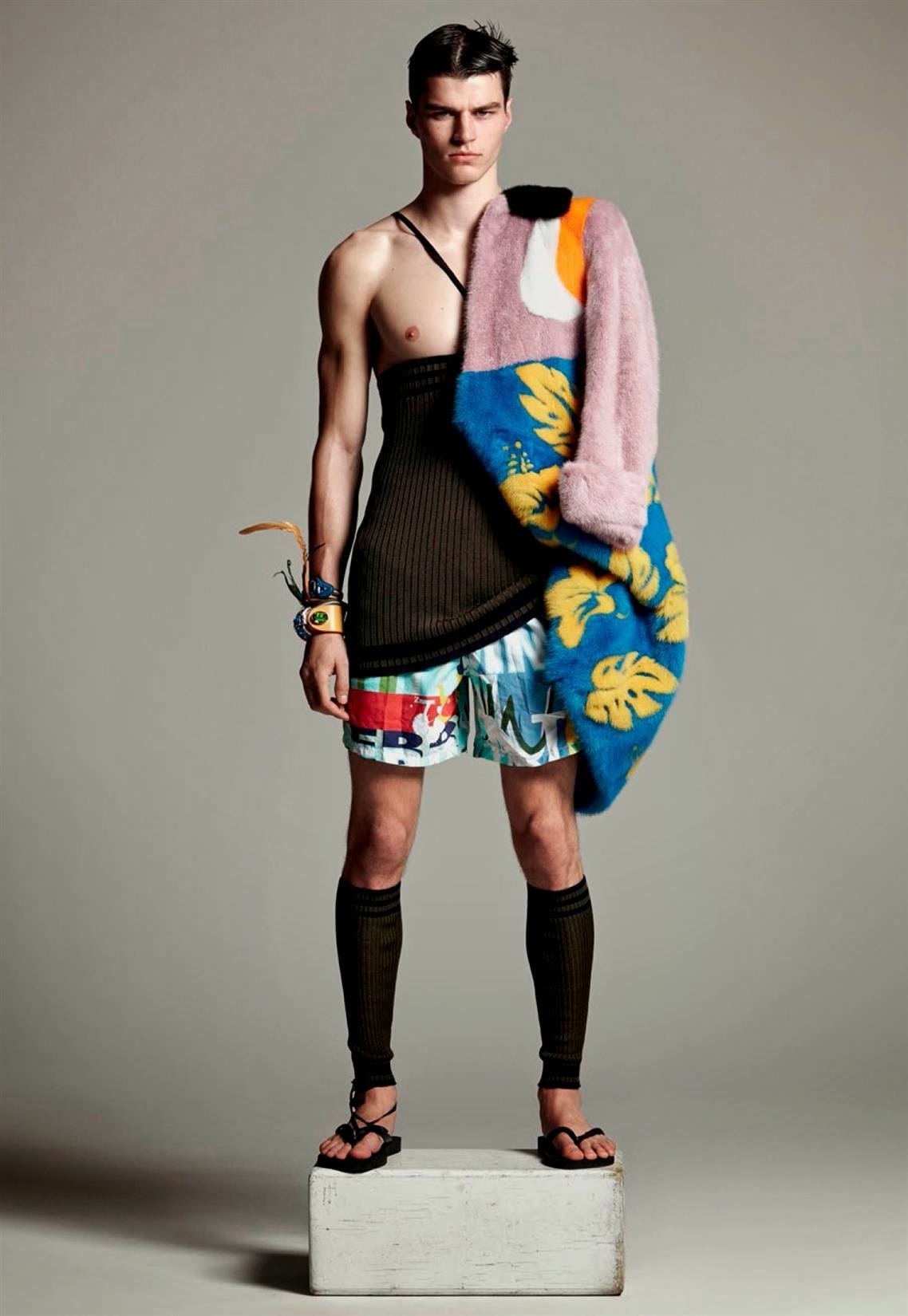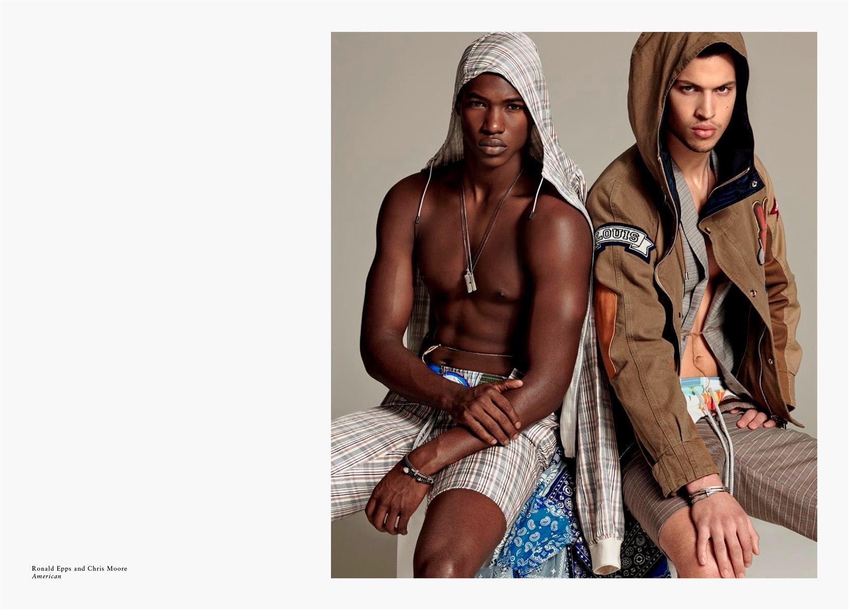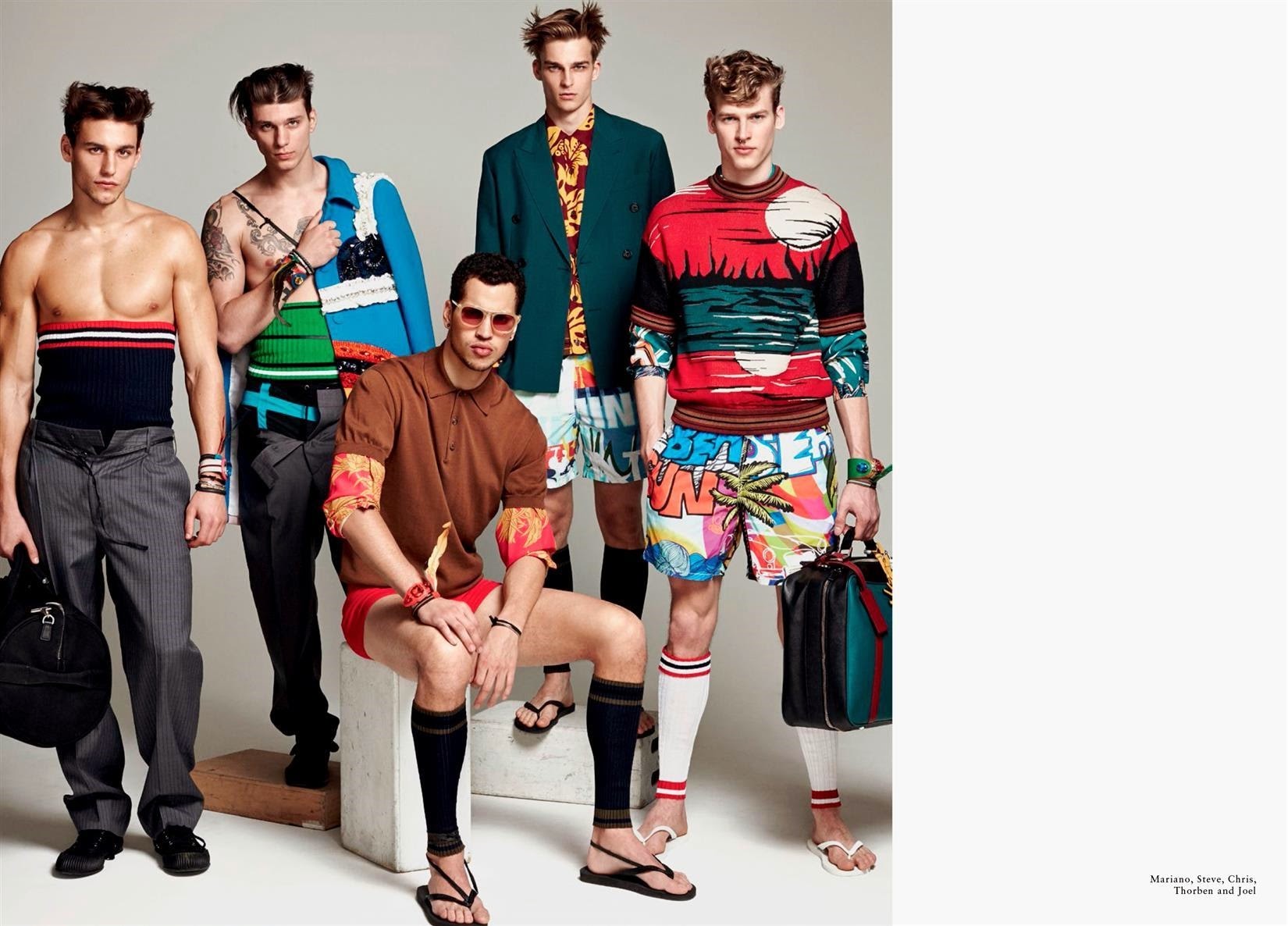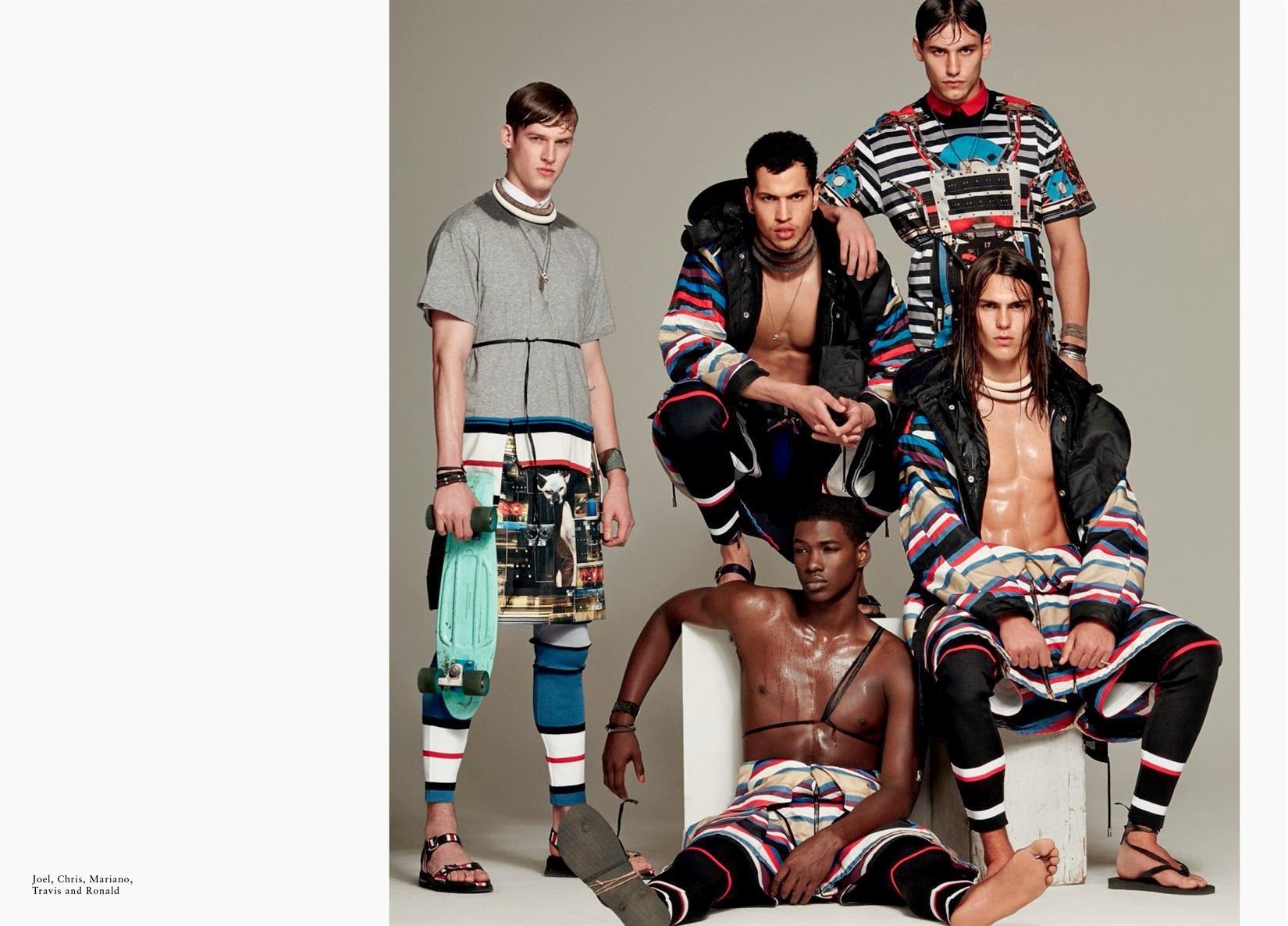 Wild Boys-Photographer Greg Vaughan and stylist David Vandewal join creative forces to shoot a bunch of models for the latest issue of Made in Brazil. With an entire issue dedicated to the concept of global male beauty, Vaughan sets his sights on models Mariano Ontañon, Arran Sly, Travis Smith, Alessio Pozzi, Chris Moore, Thorben Gartner, Steve Milatos, Ronald Epps and Joel Meacock for a variegated fashion spread. Entering the studio with their multifaceted personalities, the models are styled by David Vandewal in an eccentric and almost extravagant wardrobe, where pieces from the likes of Givenchy, Prada and Dolce & Gabbana interchange with the models bare and toned skin. / Photo assistance by Jesse Dreyfuss. Styling assistance by Tas Tobey. Hair by David von Cannon.” -The Fashionisto