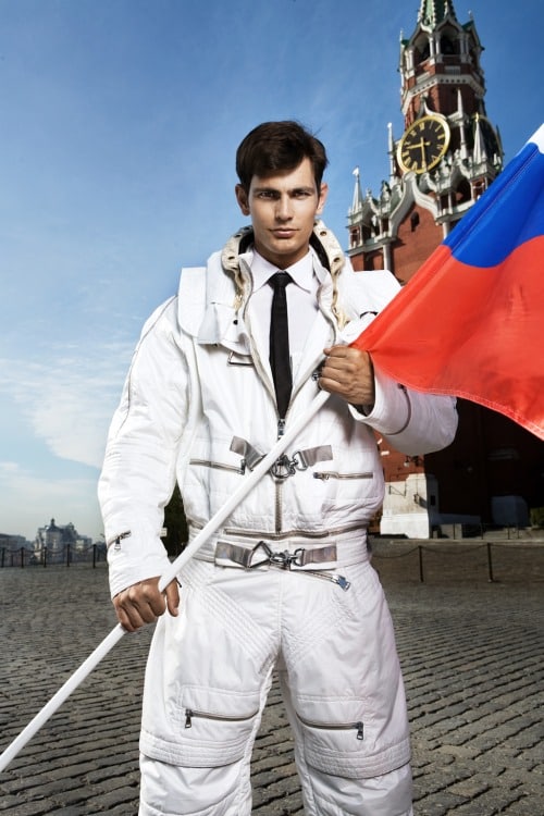 ‘Vadim Galaganov shares with us this fantastic editorial he styled for GQ Style Russia with photography by Vladimir Glynin. Inspired by Yuri Gagarin, the first human in outer space and the first to orbit the Earth, the editorial features model Marios Lekkas.’ – Homotography