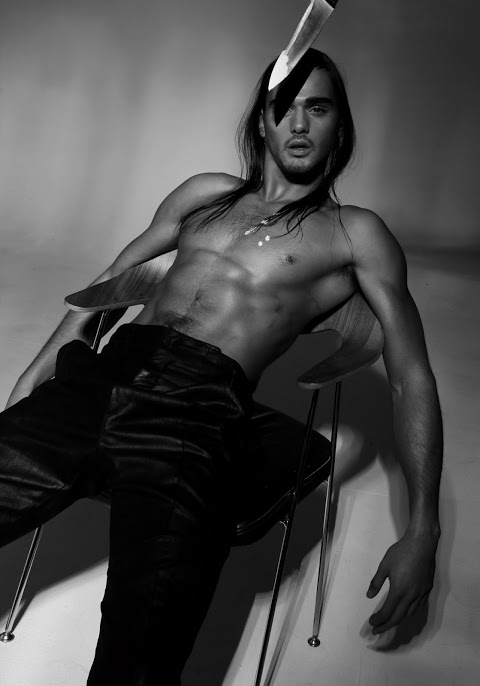 The new issue of UmnO magazine features Brazilian model Marlon Teixeira at MGM Marilyn Men in the story ‘Knight Knife’, styled by Laurent Dombrowicz and digested by Domino with hair by Masafumi Matsuda and makeup by Yann Boussand Larche. Courtesy of – Homotography