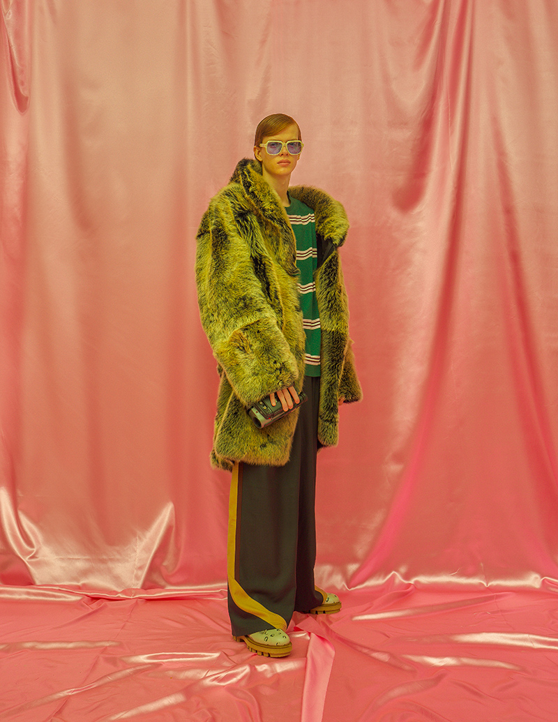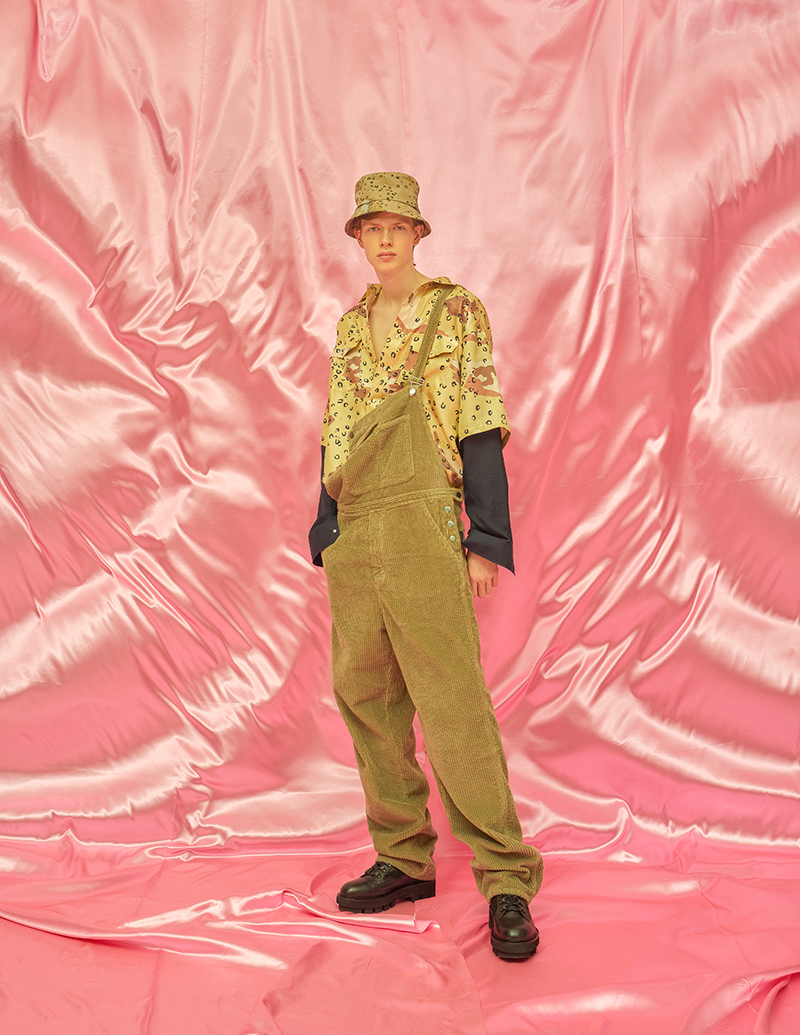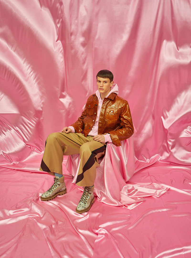 Defining elements of the collection not only include the expansion of Asbjørn’s core basics line, with entry-level hats and t-shirts to appease his loyal fanbase but also stand-out styles including a reversible shearling coat, overalls in baby pink corduroy and of course the leather “Dad Jacket” in an outrageous, shimmery croc effect.