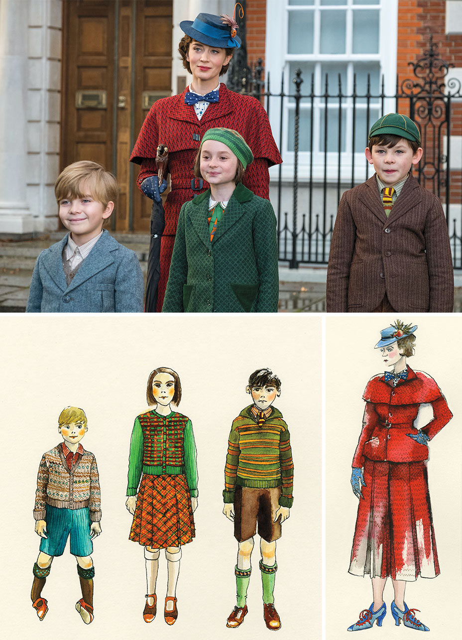 Above: Blunt with the children (from left: Joel Dawson, Pixie Davies, Nathanael Saleh), A sketch by Powell. A stickler for historical accuracy, Powell, whose next project is Gloria Steinem biopic The Glorias, “looked at images of real children in the 1930s.” The children’s clothes, like that worn by Poppins, jump off the screen, including tidy coats, short pants and Fair Isle sweaters worthy of current royal Prince George.