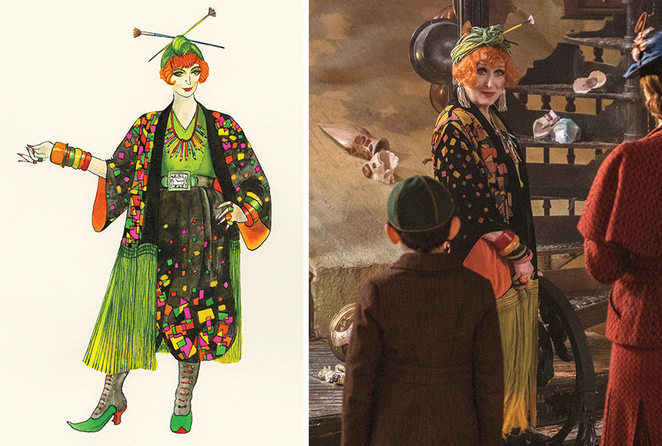 Another adventure takes the characters to the fix-it shop of Mary’s eccentric cousin Topsy (Meryl Streep), a bohemian type who, says Powell, “for some reason is of Eastern European origin” and wears harem pants, a colorful velvet kimono, armloads of bangles and a turban, a look inspired by the personal styles of real-life bohemian artist types Edith Sitwell and Nancy Cunard, among others. “We played around with kimono shapes with fringing on the bottom. I wanted bright color on black, and we looked at samples from the 1920s and ’30s. But we ended up doing a discharge print on velvet devore that we then hand-painted. It took the longest to make of anything in the entire film, and we made seven of them to have multiples. It really is couture.”