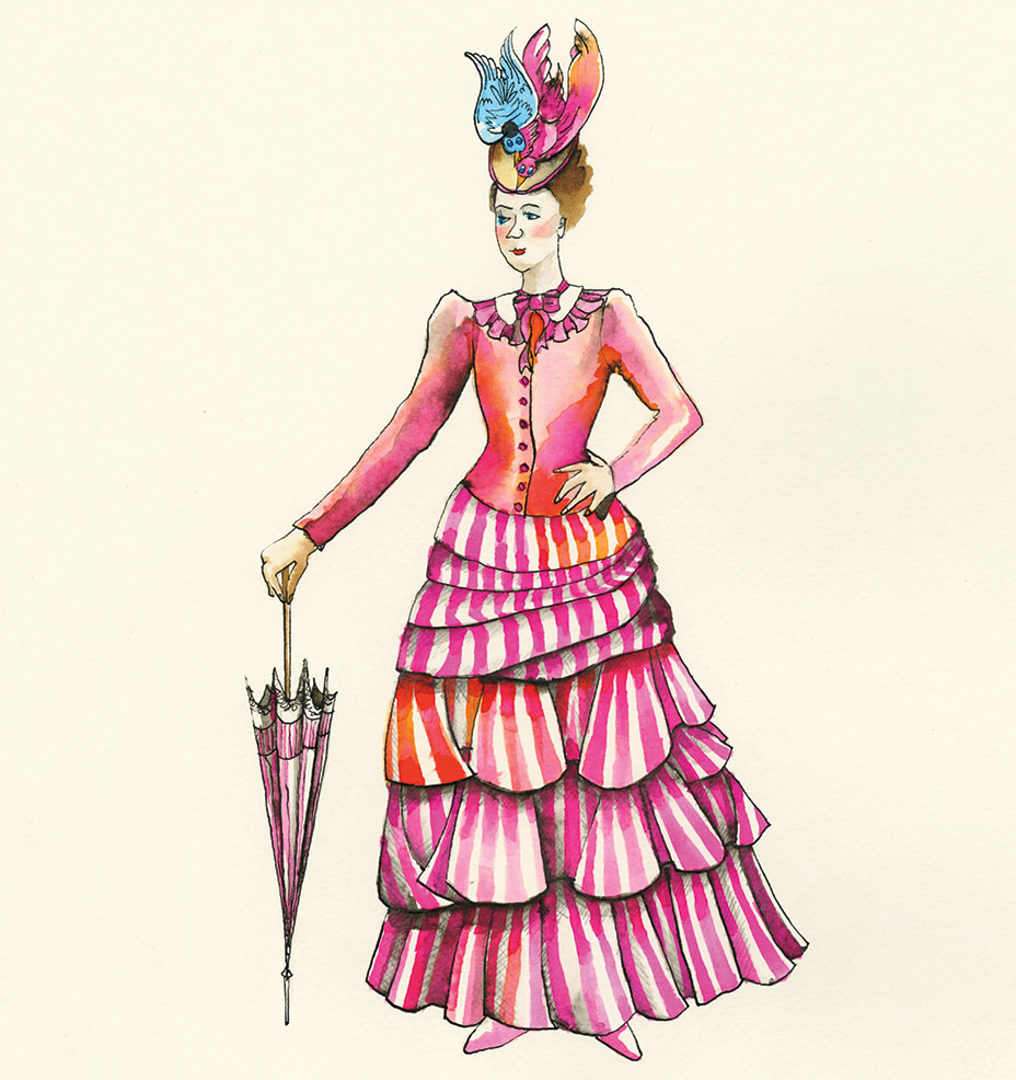 Left: “The only time I alluded to the original [film] was for Mary Poppins’ arrival outfit, tweaked for 1934,” says Powell of the belted coat with short double cape, red straw hat, and red gloves and shoes; Milliner Sean Barrett made Poppins’ red and blue hats; the robins are by Haruka Miyamoto (who made Cinderella’s ball-gown butterflies in the 2016 movie Powell also worked on).