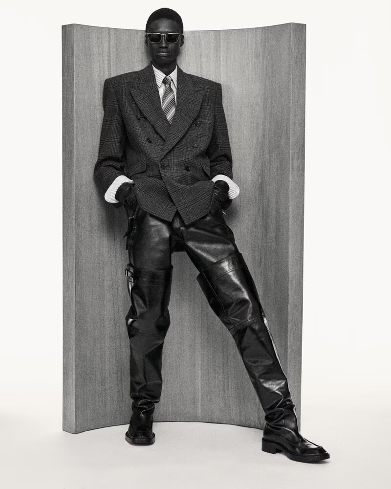 This season’s silhouettes are fortress-like: sweeping lambskin coats, squared shoulders, and leather trousers that read like armor. Accessories—motorcycle belts, thigh-high boots, and wide silk ties—intensify the mood, pushing the familiar office suit toward ritual uniform. Vaccarello’s vision isn’t just about fashion—it’s about containment, control, and the performance of power.