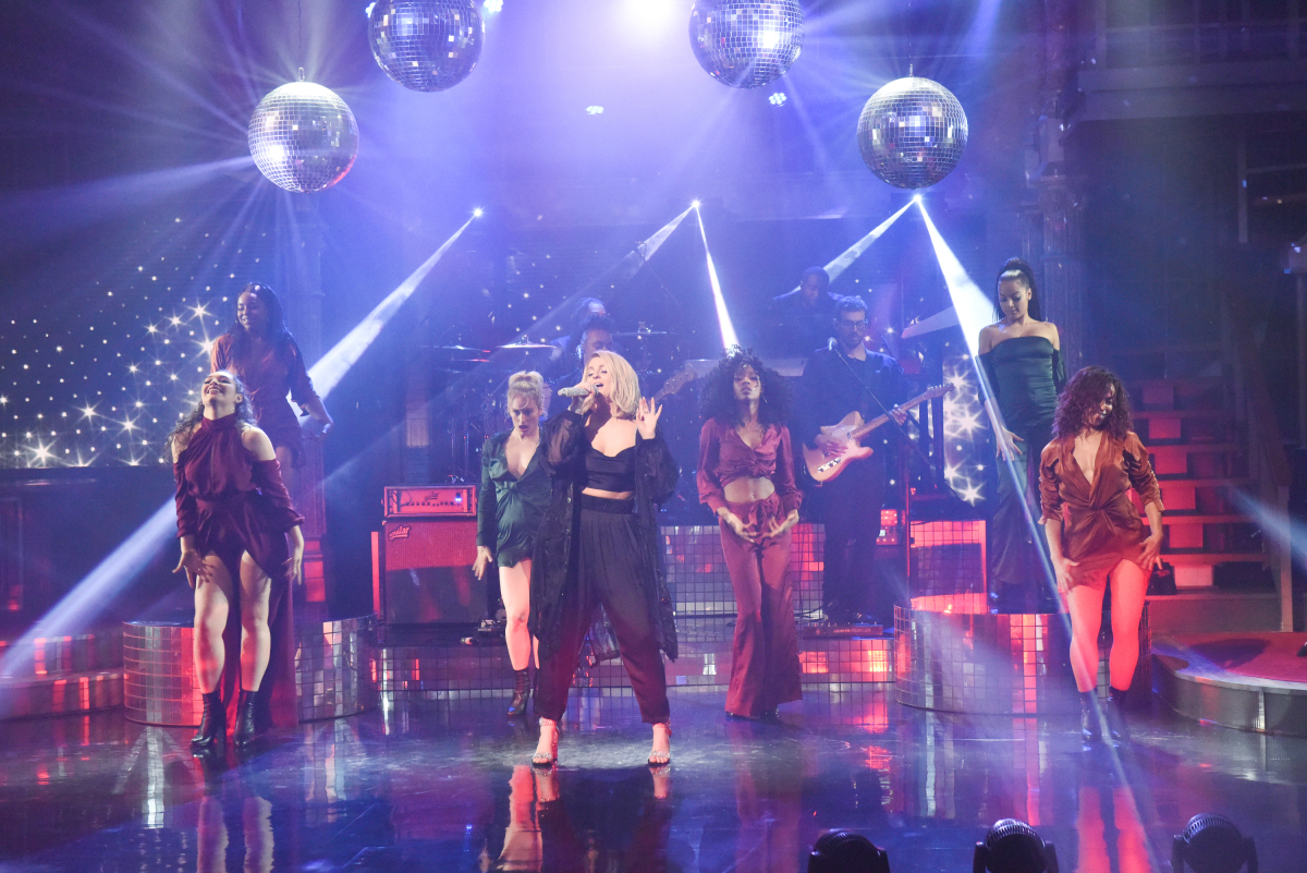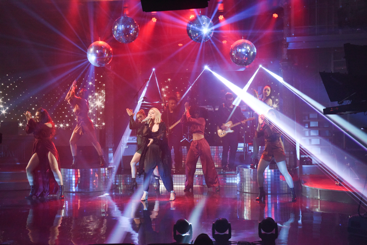 The Grammy-winning strutted her saucy fanny on thee Late Show With Stephen Colbert closing out the program with other familiar faces such as artists in their own right Josh Groban, Sara Bareilles, and pop princess Mandy Moore!