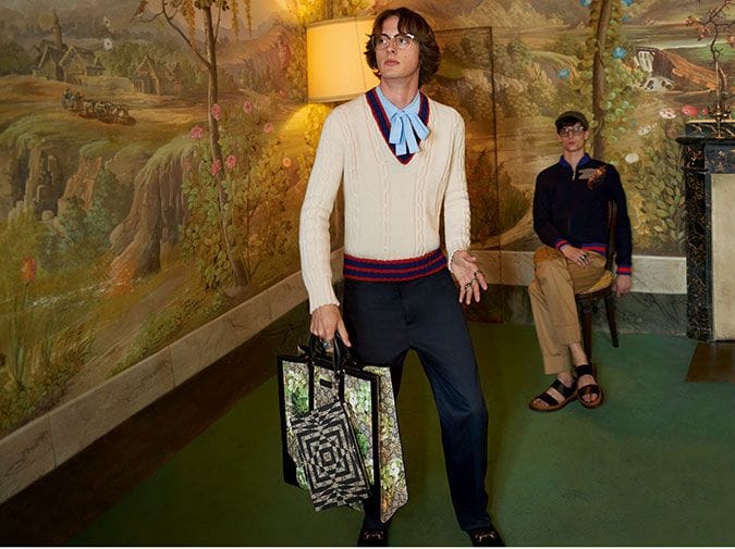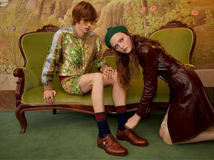 “A slithering snake traces languidly its way on the grass of a garden that seems more an illusive place than a real landscape – the Garden of Ninfa near Rome- populated by an animal omnium-gatherum. Alessandro Michele has accustomed us to his dreamy vision and take on Gucci – halfway a psychotic entrancement induced by MDMA and a pre-raphaelite awesomeness- but, with the Italian-Canadian photographer and director Floria Sigismondi as partner in crime, the result is of unparalleled sophistication. The film captures the gist of the 2017 Cruise Collection thrown at Westminster Abbey last June. Gucci’s sinners float in an Eden of precious silks, exquisite embroideries, elaborate knitting, ruffles and GG supreme canvas.” – FY Magazine.es