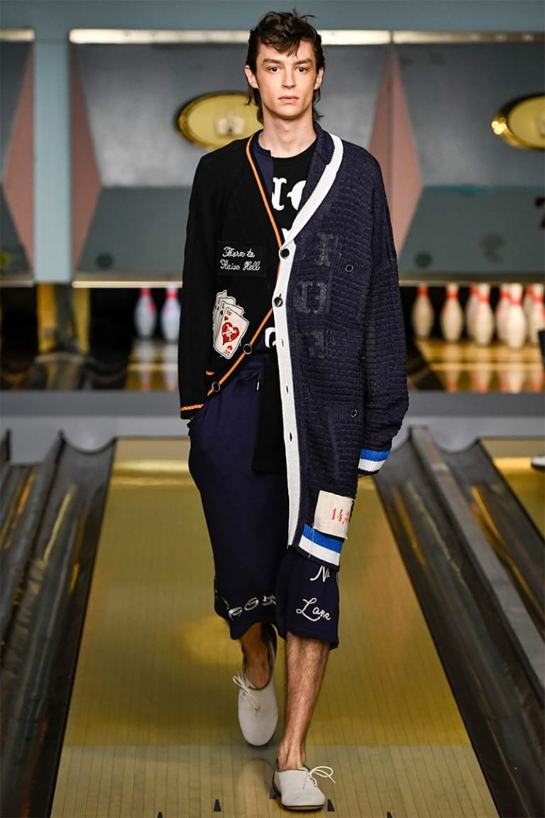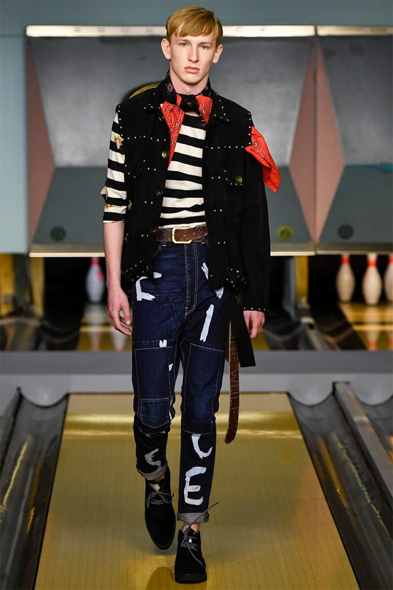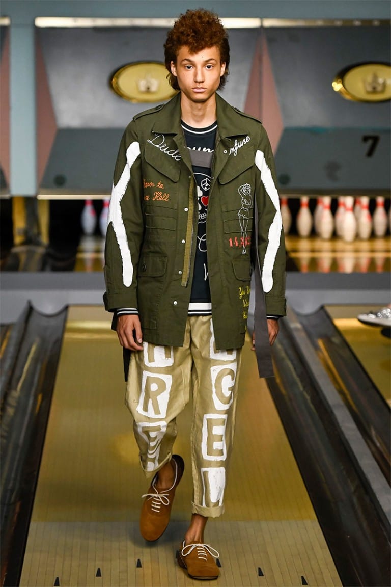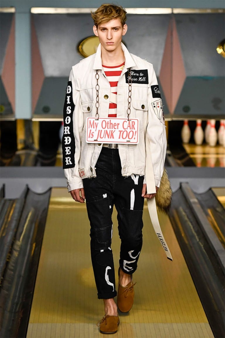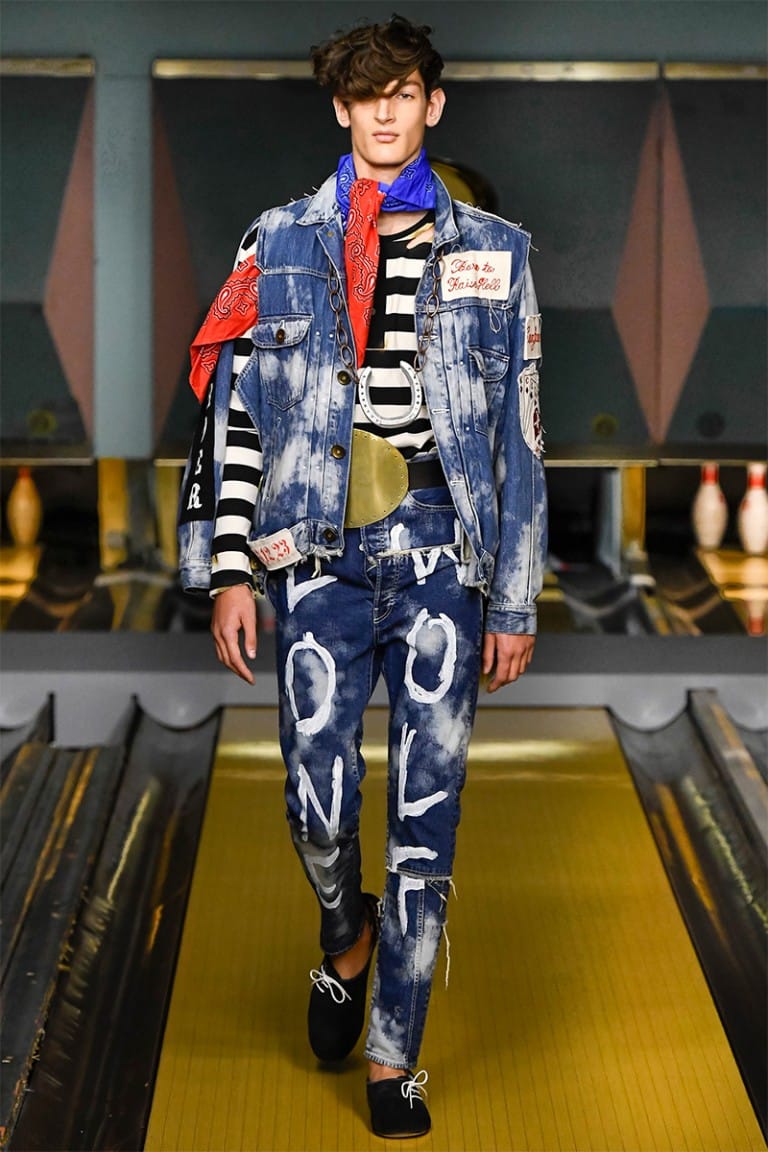 With references to Elvis Presley and James Dean, each look was made individual by hand drawn customisation on raw denim and biker jackets. Patches adorned leather arms with cultural references to gambling and tattoos, while vintage cartoon characters winked from the back of a denim trench coat. Military references continued with the remake of 60’s Souvenir silk jackets, providing a slightly feminine edge to a collection full of rascals.