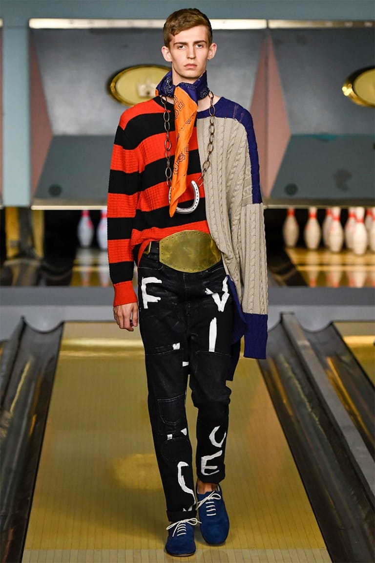 Just like the distressed knits, styling was intentionally messy with shirts tucked into jeans asymmetrically to mirror odd coloured trouser legs. Raccoon tails hung from belt hooks and multiple handkerchiefs were layered around the neck in a variety of colours. Classic shoes were redesigned; penny loafers came in patent black and silver with a contrasting heel, rubber soled trainers featured a cage design on the heel and creepers mixed with a moccasin and desert boot in one.” – FY Magazine.es