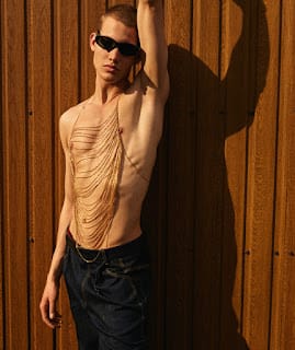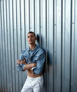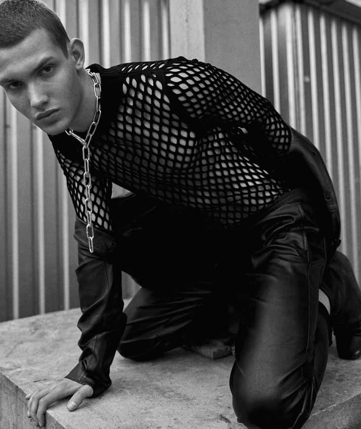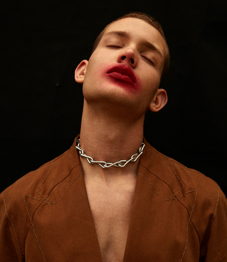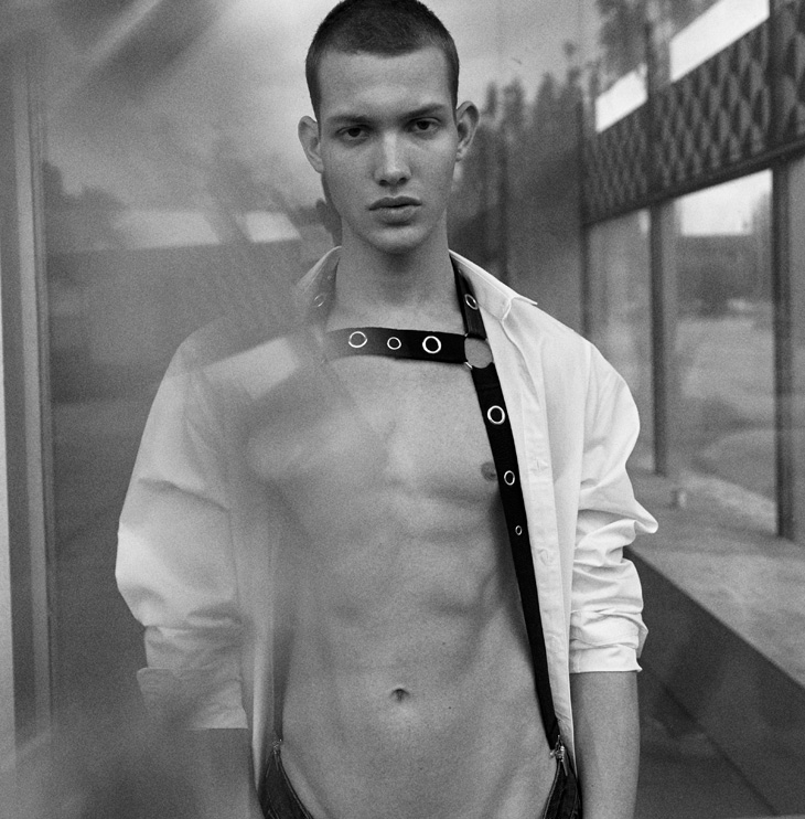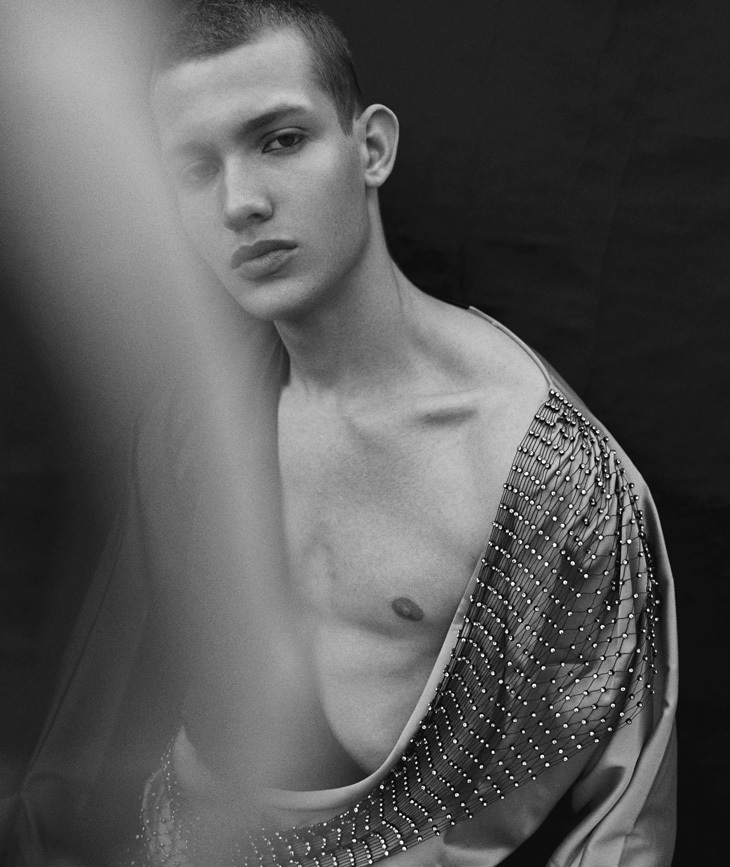 For the story Anton is wearing selected pieces from Topshop, Versace, Frolov, Jiwinaya, Saint Laurent, Calvin Klein, and Jean Gritsfeldt.