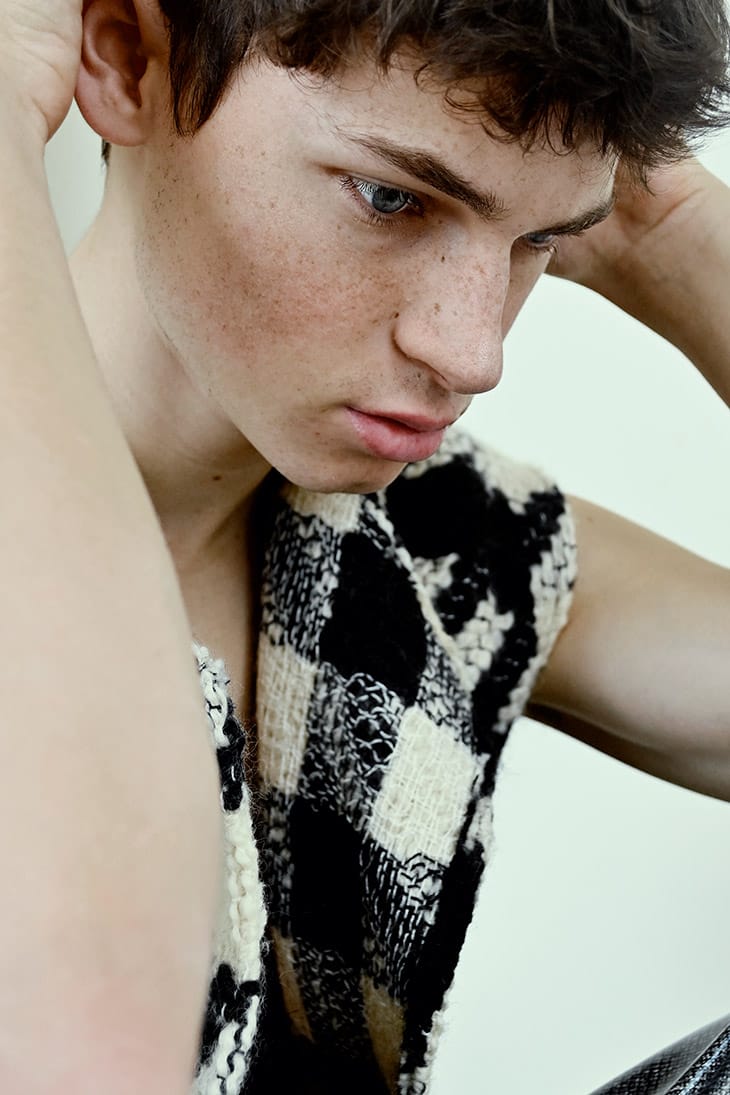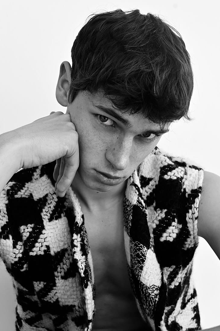 For the session stylist Atias Huynh selected pieces from Cocoshnick, Victoria Andreynova, Gunther Paris, and Arche.” – Malemodelscene.net